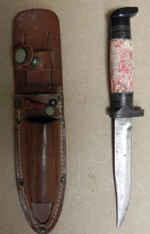 THIS IS AN OLD SKINNING KNIFE W/LEATHER SCABBARD--4 1/2" BLADE. GRIP CENTER STRIPPED & STICKY IN PARTS- BLACK TOP & BOTTOM OF GRIP --NICE LEATHER SCABBARD WITH STRAP RETAINER--APPEARS TO HAVE BEEN A SECOND KNIFE IN FRONT POUCH.