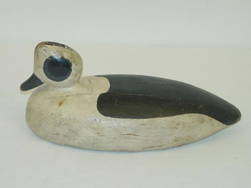 OLD SQUAW HEN DECOY-CARVED FROM WOOD FROM CRANBERRY ISLANDS ME & PAINTED (CIRCA 1920'S 5" T X 11" L X 4 3/4" W) - TIGHT CRACKS IN WOOD, LIGHT WEAR, CHIPS TO PAINT