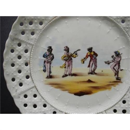 THIS IS RARE AND BEAUTIFUL ANTIQUE PLATE, NUMBERED 201 AND TO MY KNOWLEDGE IT WAS MADE IN GERMANY EARLY IN 1900's- IT DEPICTS FOUR BLACK MUSICIANS, THE PLATE IS MADE IN OPEN WORK AND RAISED PATTERN AND OF VERY GOOD QUALITY - as per images - EXCELLENT CONDITION,BUT IT DOES HAVE ONE VERY,VERY FINE STRESS HAIRLINE ABOUT 4" LONG LOCATED THRY BANJO PLAYER, VERY HARD TO SEE, Measuring about 9" in diam., US Buyer to pay 9.00 for shipping plus insurance.THANKS.