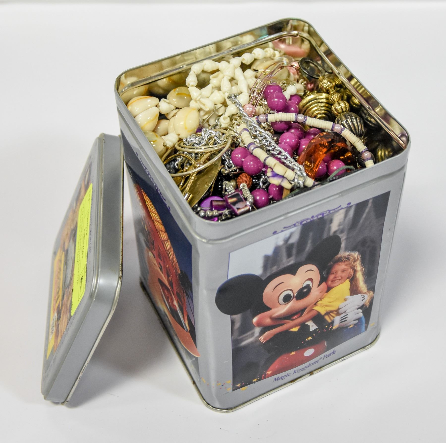 OLD TIN FILLED WITH ESTATE JEWELRY, USED MISC.
