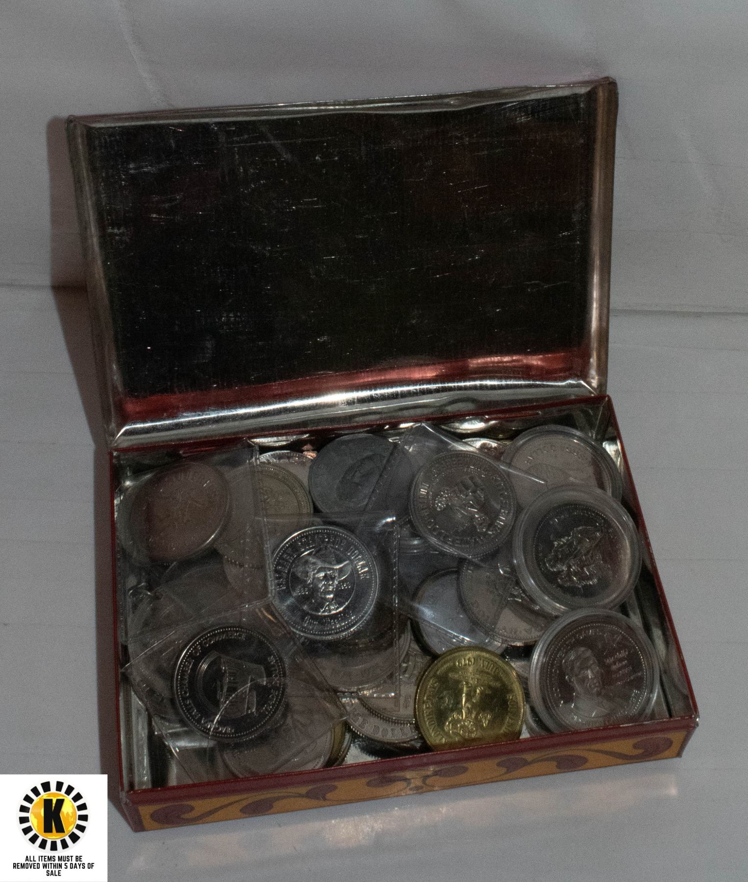 OLD TIN FILLED WITH VARIOUS TOKENS & MEDALS ETC.