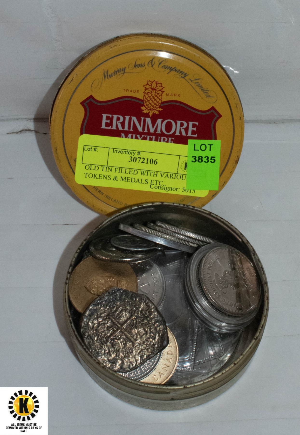 OLD TIN FILLED WITH VARIOUS TOKENS & MEDALS ETC.