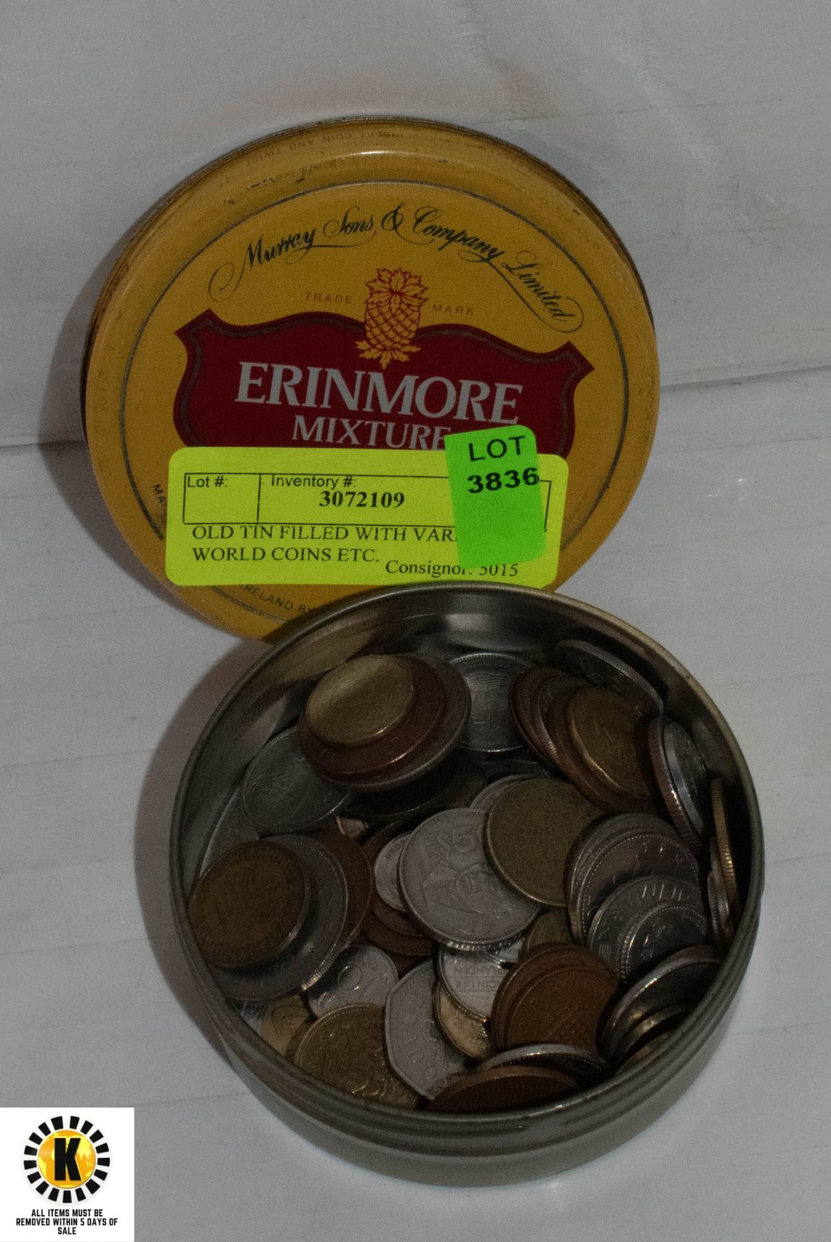 OLD TIN FILLED WITH VARIOUS WORLD COINS ETC.
