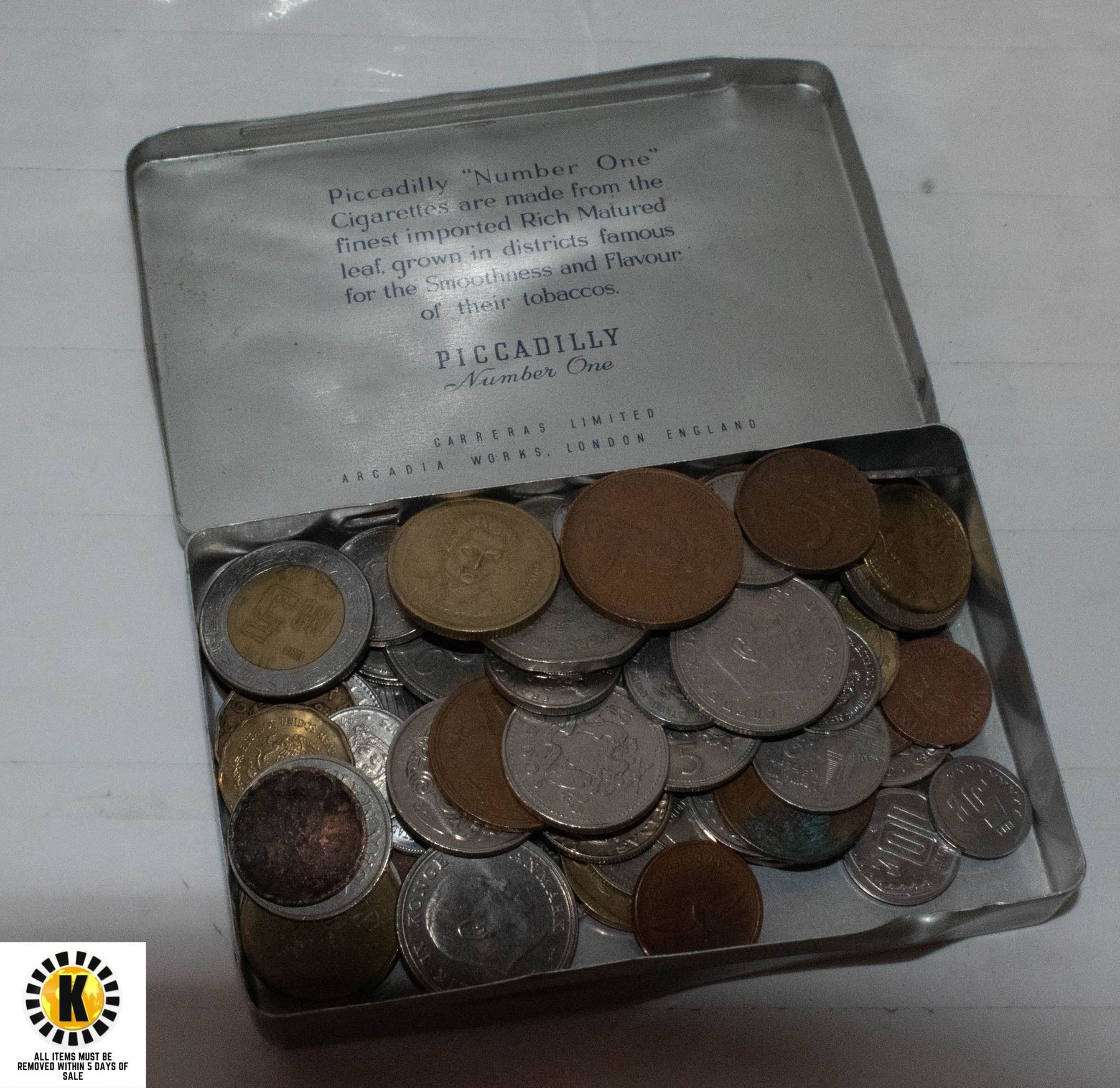 OLD TIN FILLED WITH VARIOUS WORLD COINS ETC.