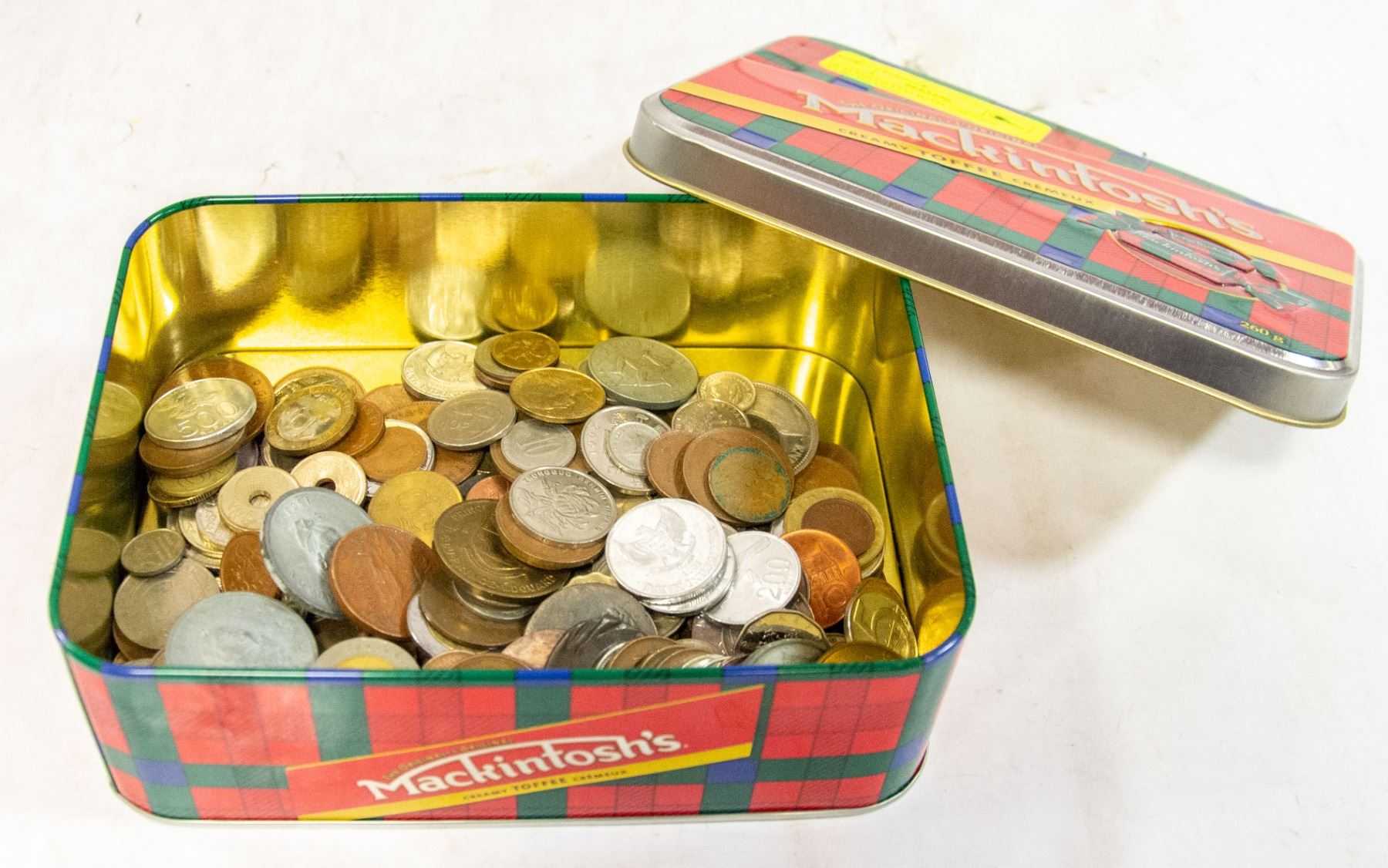 OLD TIN FILLED WITH VARIOUS WORLD COINS