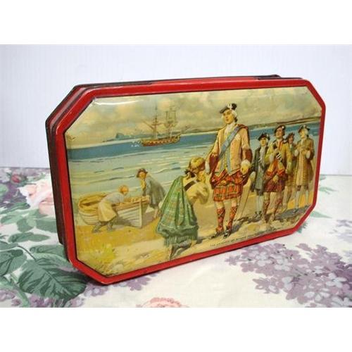BEAUTIFUL OLD TIN BOX, MADE IN ENGLAND BY GEORGE W. HORNER & CO., DEPICTING GROUP OF PEOPLE GREETING BONNIE PRINCE CHARLIE, LANDED AT ERISKAY, IN THE DISTANCE THERE IS OLD STYLE SHIP, BEAUTIFUL TIN AND PEOPLE DEPICTED,SOME OF THEM, WEARING SCOTTISH OUTFITS,INCLUDING THE PRINCE, Measuring about 8 inch x 5 inch and 1 1/2 inch high, Excellent condition for it's age,tiny bit of paint loss and 2 shallow dents that could be easily straighten out.US Buyer to pay 7.00 for shipping plus insurance.THANKS.