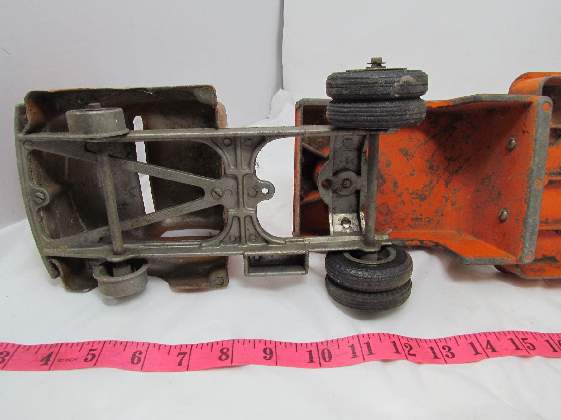 OLD TIN TOY TRUCK WITH FLAT DECK TRAILER