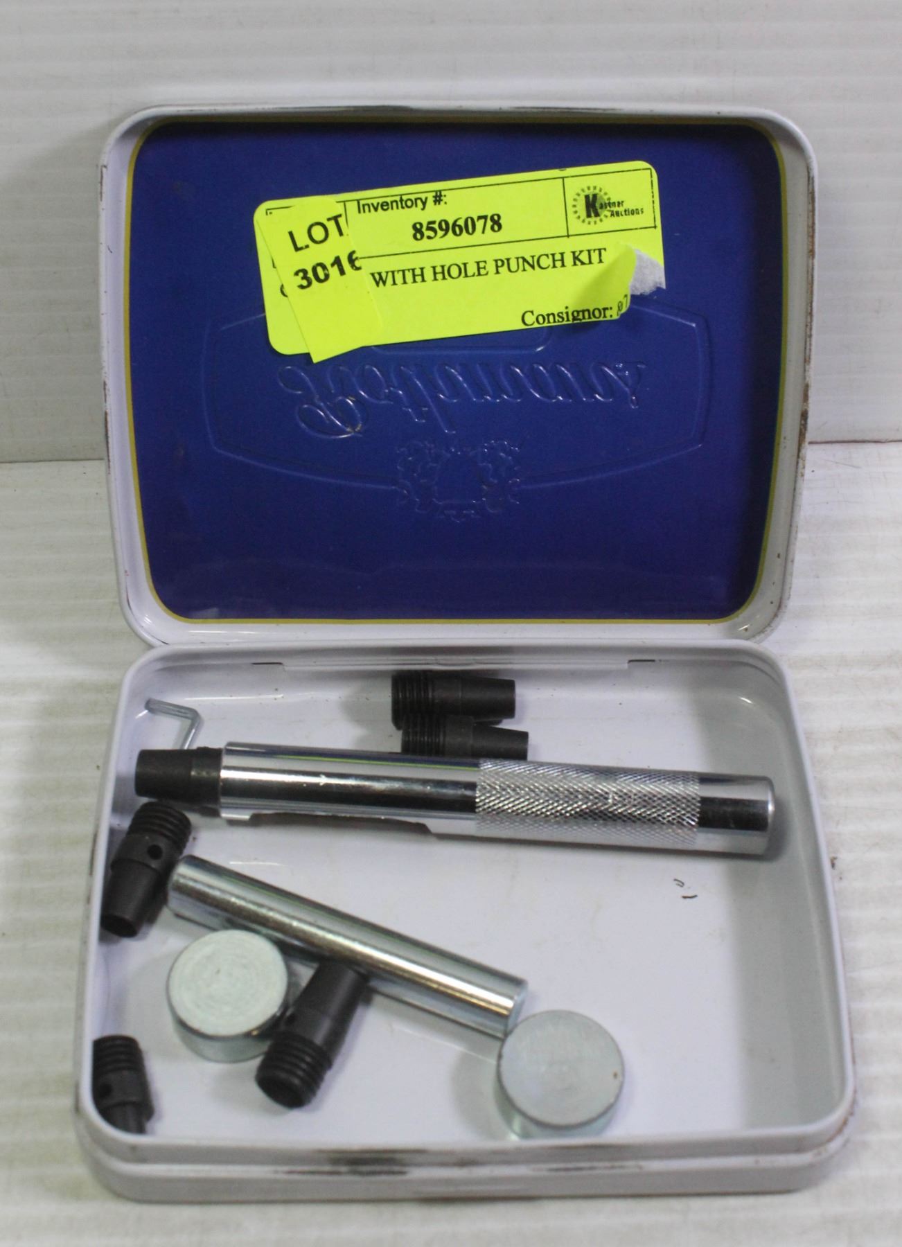 OLD TIN WITH HOLE PUNCH KIT