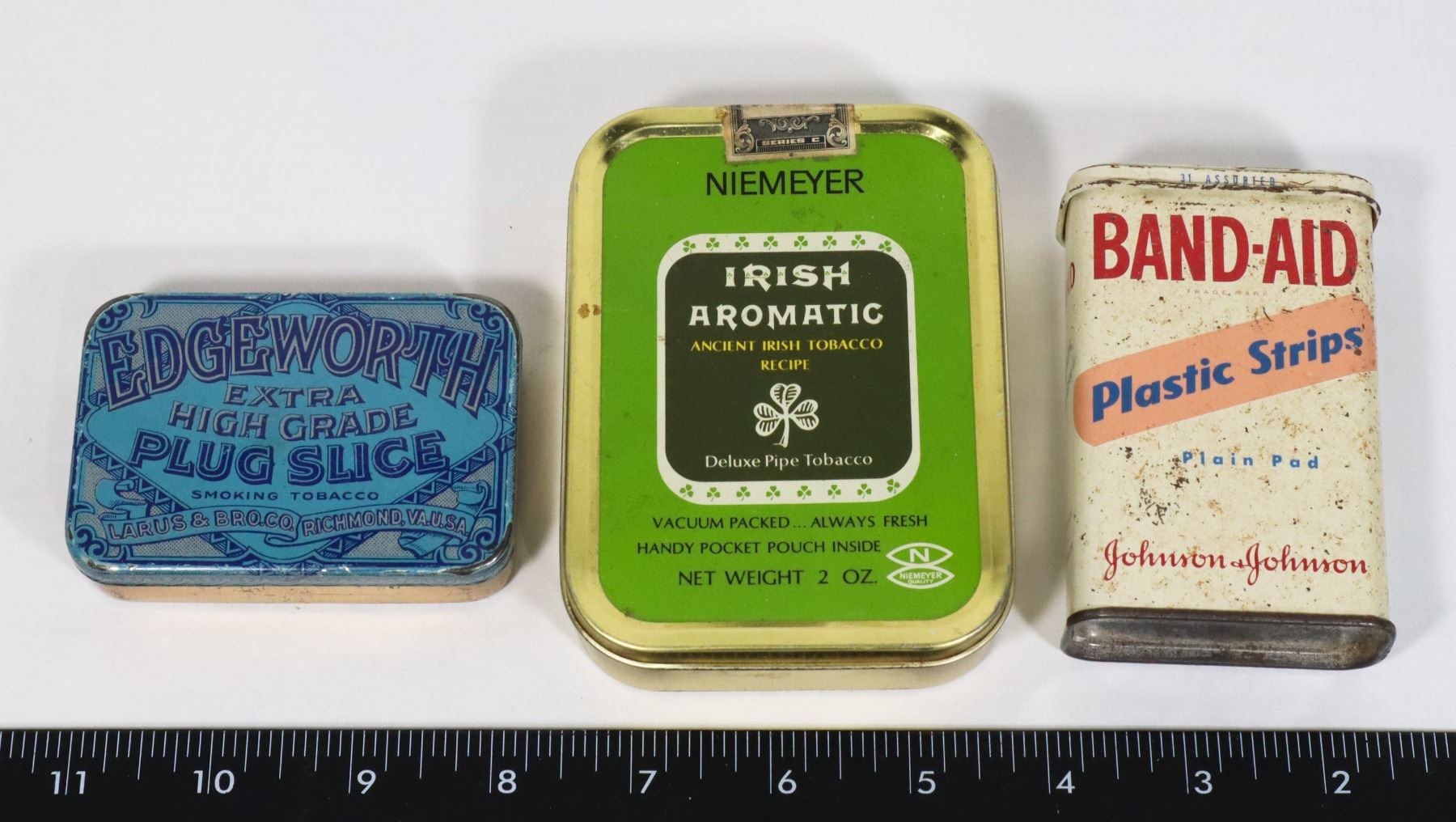 OLD TINS: BAND AID, EDGEWORTH, IRISH AROMATIC.