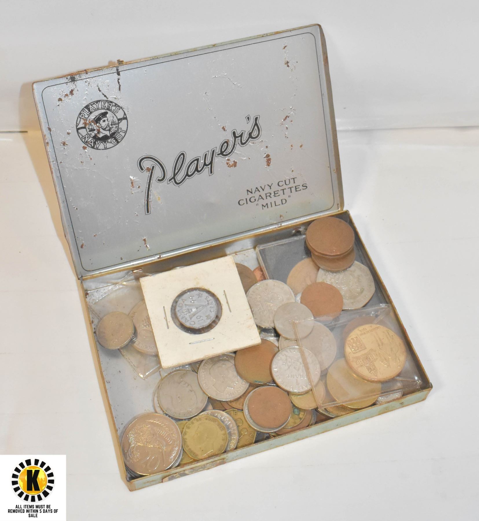 OLD TOBACCO TIN FILLED WITH VARIOUS OLD WORLD