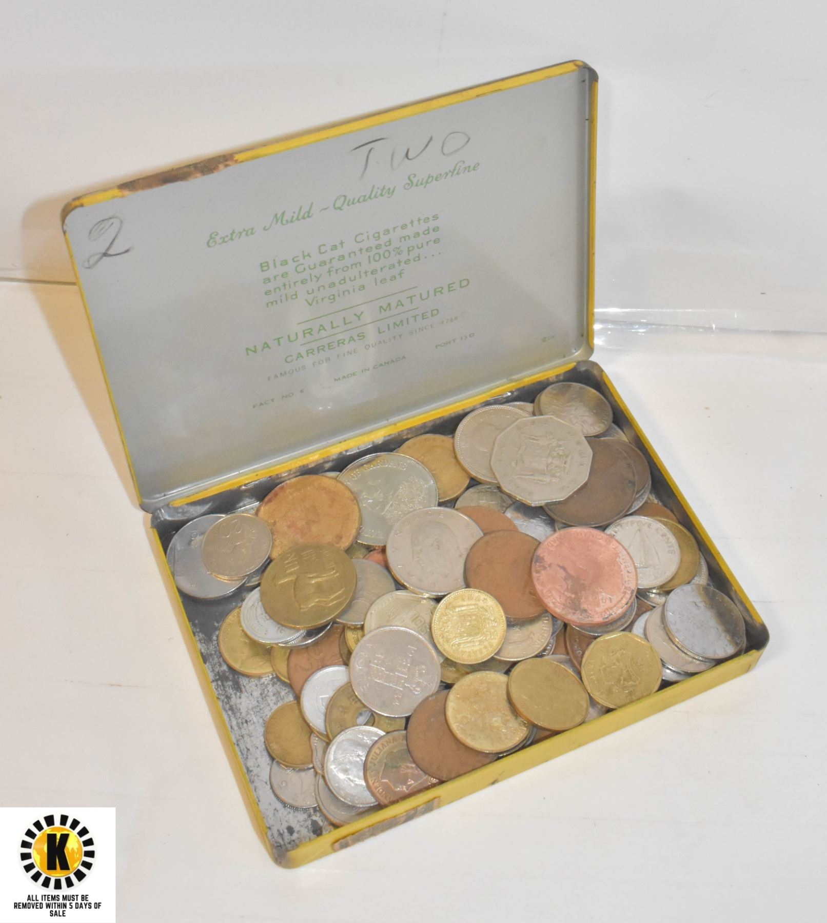 OLD TOBACCO TIN FILLED WITH VARIOUS OLD WORLD