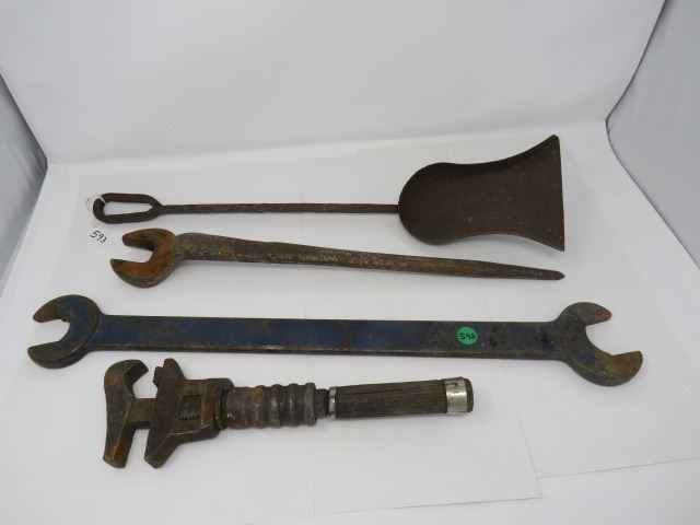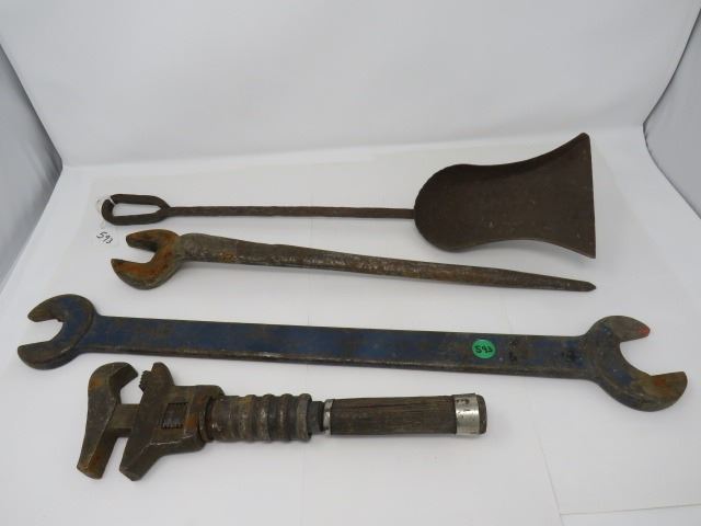 OLD TOOLS, MONKEY WRENCH & HAND FORGED SMALL SHOVEL