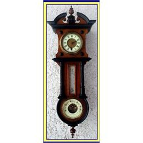 Walnut and ebony wall clock with thermometer and barometer.<BR>27 inches long.<BR>Elegant finials on either end. Clock, barometer and thermometer all appear to be in good working condition.<BR>Clock and barometer enclosed in brass mounts. Crossed arrows in center. Porcelain face of clock has shallow chip between the VI and VII, which is the only visible <BR><BR>damage.