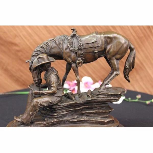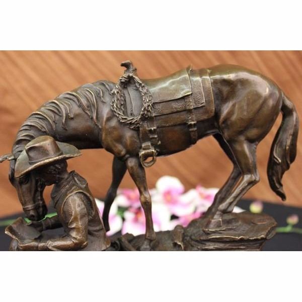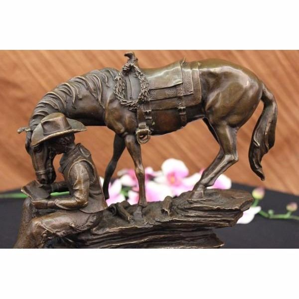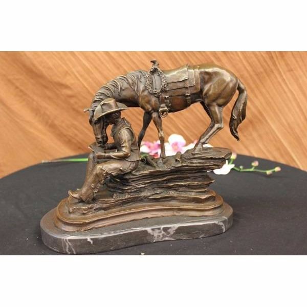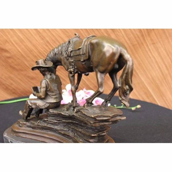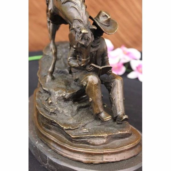 This piece is a fabulous depiction of the unity of man with animals. It features a cowboy fully adorned in frontier pants, cowboy boots,a vest, a bandanna, and a bull hide hat. He reads a book while seated on the ledge of a cliff while his horse loyally stands by his side, so close that it appears that the creature is partaking in the words on the pages. This piece is full of tiny aspects that when compiled, create a highly authentic creation. This can be seen in details like the rope tied to the horse's saddle, the cascading of the creatures mane and tail, the construction of the cowboy's face, and the beautiful manner in which the staggering rocks of the cliff on which both subjects are seated create a true sense of space and atmosphere. It is crafted with the finest detail cast in a deep brown patina using the lost wax method and mounted on a black marble base. Get one today to recapture the spirit of the Old West. Condition: This sculpture is inperfect condition. Bronze Dimensions with Marble Base:Height 11" x Width 14" Marble Dimensions: Diameter 11 1/2". Height without base: 10" Weight : 18 LBS Inventory 94Y5807949