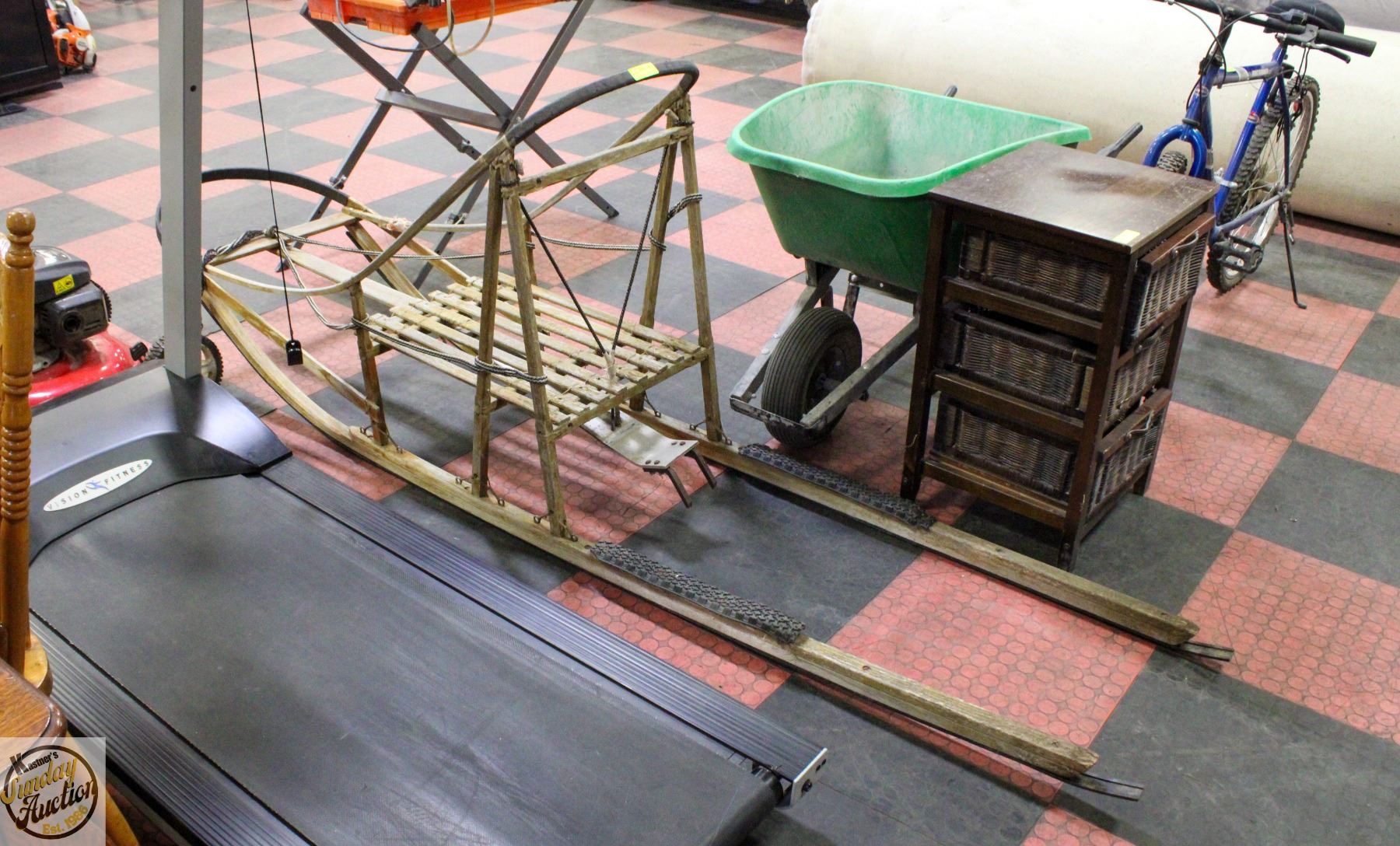 TRADITIONAL WOODEN DOG SLED WITH KICK BAR; 9 FEET LONG **ALL ITEMS MUST BE REMOVED BY 5PM SATURDAY, NOVEMBER 15TH 2025. ALL REMAINING ITEMS WILL BE SUBJECT TO A $6.00 PER DAY STORAGE CHARGE. ANY ITEMS REMAINING AFTER MONDAY, DECEMBER 1ST 2025 WILL BE CONSIDERED FORFEITED. NO REFUNDS WILL BE ISSUED FOR FORFEITED ITEMS. TO SCHEDULE A PICK UP APPOINTMENT