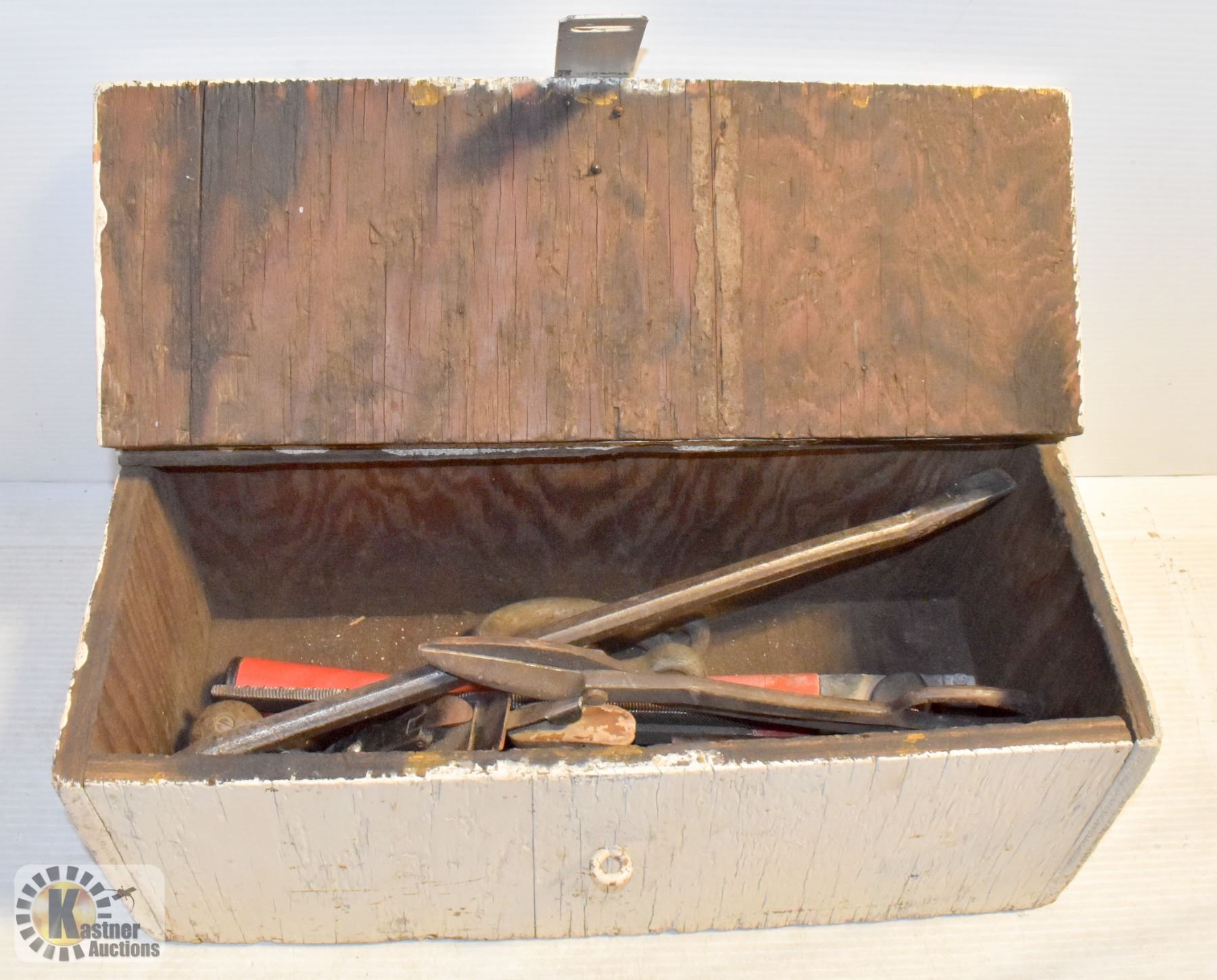 OLD WOODEN TOOLBOX WITH VINTAGE TOOLS