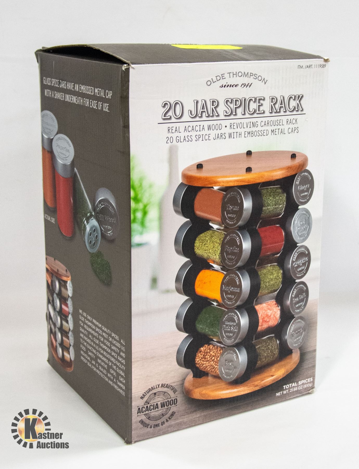 OLDE THOMPSON STAINLESS STEAL ROTATING SPICE RACK, 20 REFILLABLE SPICE JARS WITH SHAKER TOPS AND LIDS **ALL ITEMS MUST BE REMOVED BY 5PM SATURDAY, DECEMBER 16TH 2023. ALL REMAINING ITEMS WILL BE SUBJECT TO A $6.00 PER DAY STORAGE CHARGE. ANY ITEMS REMAINING AFTER TUESDAY, JANUARY 2ND 2023 WILL BE CONSIDERED FORFEITED. NO REFUNDS WILL BE ISSUED FOR FORFEITED ITEMS. TO SCHEDULE A PICK UP APPOINTMENT CLICK HERE