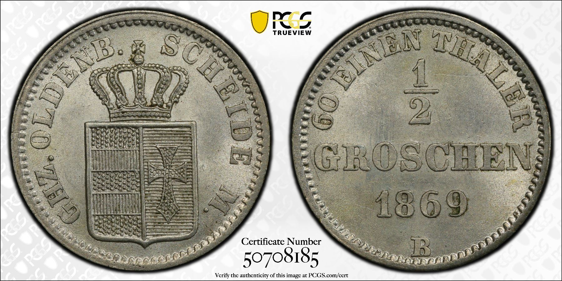 OLDENBURG: Peter II, 1853-1900, AR 1/2 groschen, 1869, PCGS MS64
