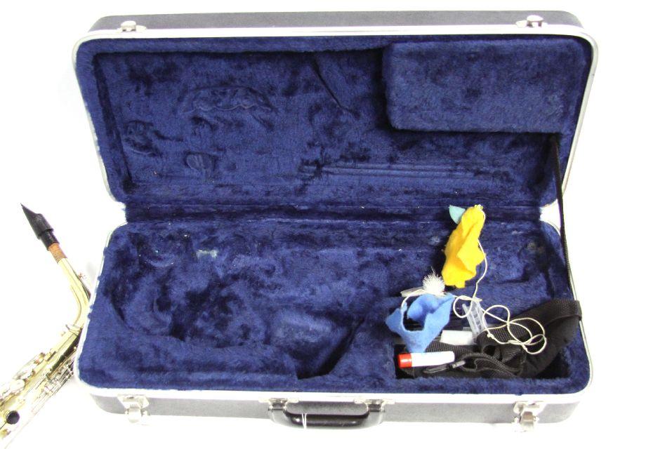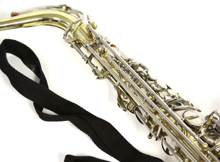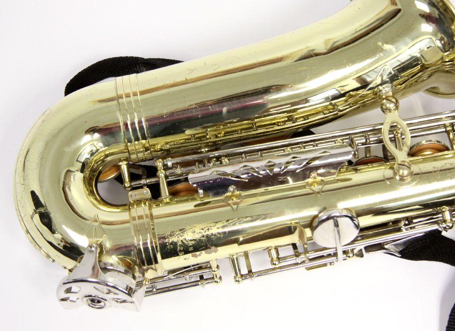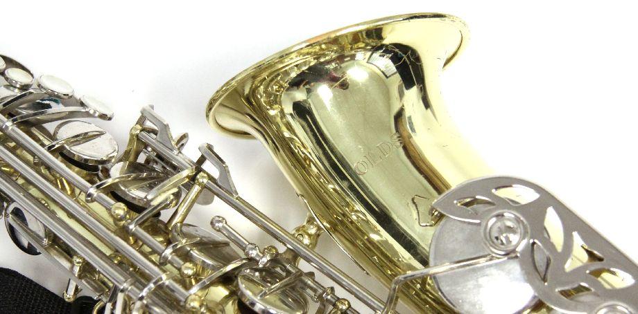 Olds NA62MN alto saxophone complete with case (25 x 10 x 7 inches), neck strap, and cork grease. Has a couple very small dents to the bell area, otherwise detractions will be mostly scratches on the bell and neck. Otherwise it appears to be in very good condition.
