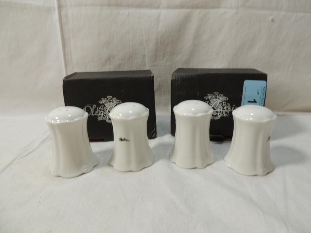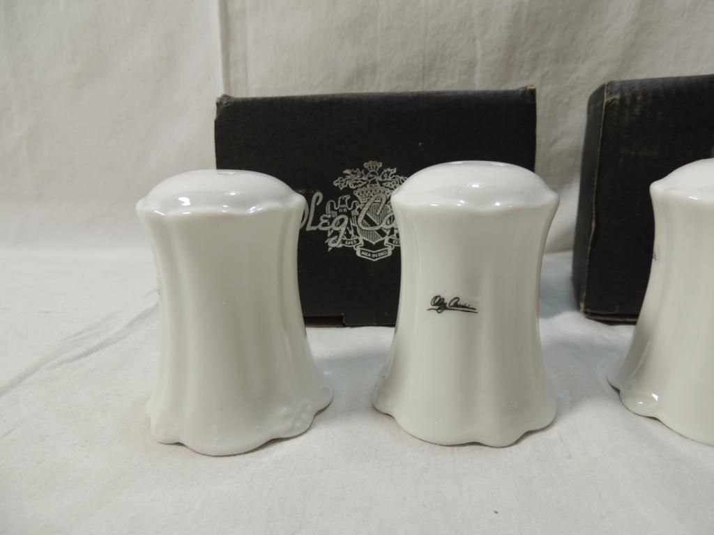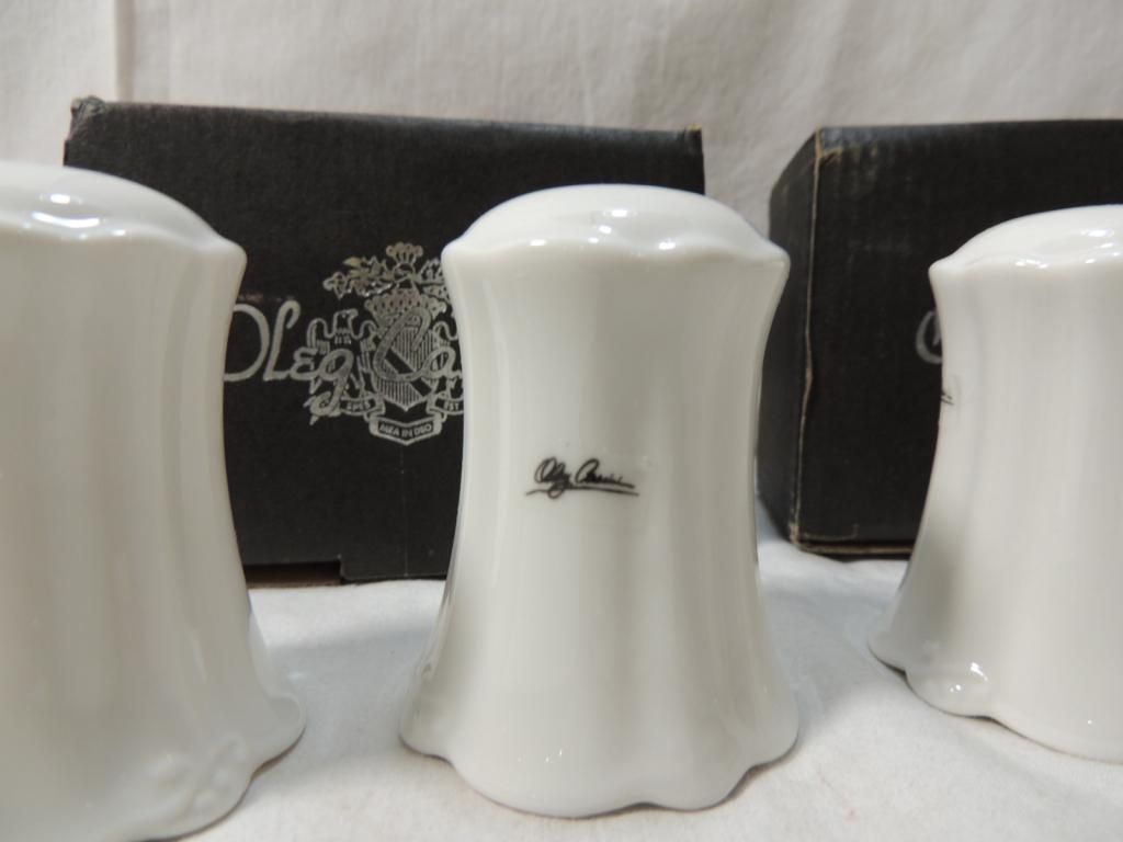 OLEG CASSINI SALT & PEPPER SHAKERS. TWO SETS. AS SHOWN. WHITE CERAMIC SALT & PEPPER SHAKER. AS SHOWN.