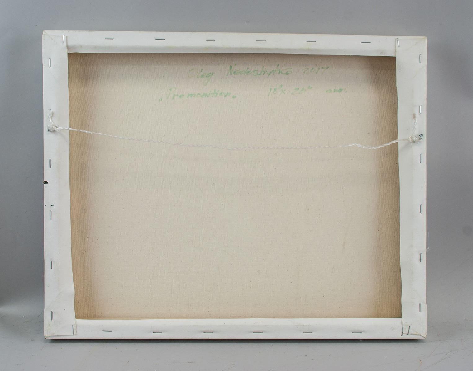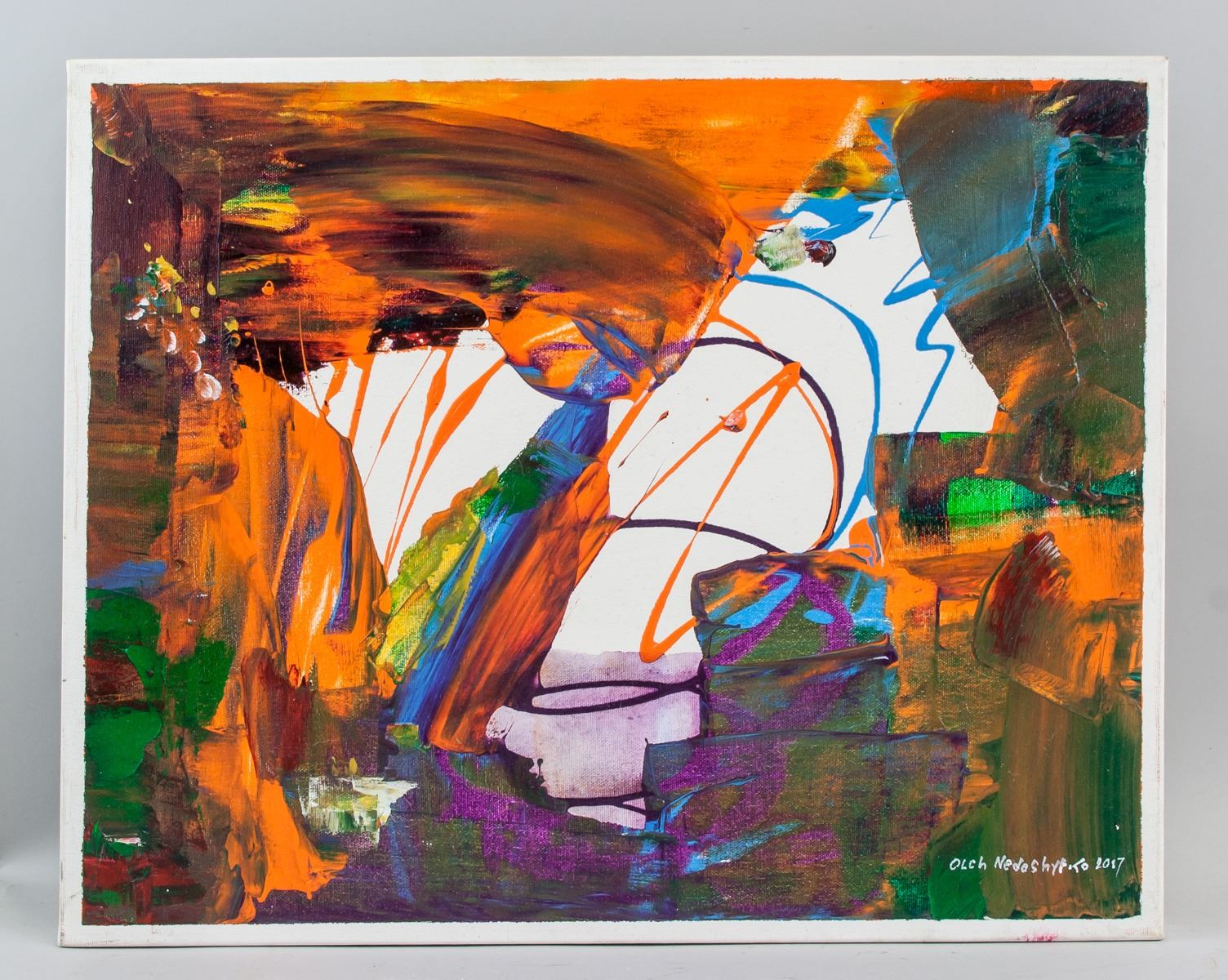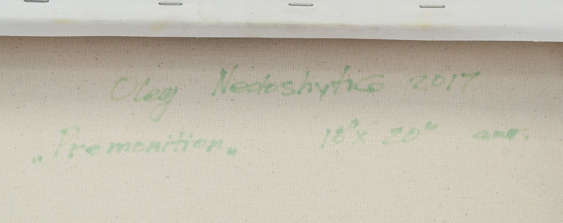 Acrylic on canvas. Featuring an abstract composition, entitled, Premonition." Signed by Oleg Nedoshytko (Ukranian-Canadian, born 1950) and dated 2017 on the lower right corner. 18 x 20 in (45.7 x 50.8 cm). At twenty one, Oleg Nedoshytko was listed in reserve after serving his mandatory military term as a nurse, and his choice of a career seemed predetermined: with his experience, the doors of a highly prestigious Medical School were open for him. In the meantime, he looked for a summer job in his native city of Odessa, a large port city on the Black Sea in southern Ukraine. He found it in a commercial advertising studio. That day changed his life. Working with paint opened a new world for him. From that point on, his suddenly discovered passion for art took care of his future. In the following months, Oleg became a fixture in local museums, copying nineteenth century masterpieces and drawing marble statues of ancient Greek gods. In 1972, he was admitted to the department of visual arts of South Ukrainian National University of Education. He graduated with a bachelor degree in Fine Arts five years later, having come a long way from a novice to a fully qualified professional. That same year, Oleg was invited to return to his alma mater in Odessa, this time in a teaching capacity. He provided instruction in classical observation and figure drawing, painting and composition for nearly forty years. From 2007 to 2015, he held a professorial position with the Chair of Visual Arts in his department, and in 2011 and 2012 , served as its Dean. His students are now working around the world, and his theoretic works and instructional books have been printed in professional magazines in Ukraine, Europe and the USA. In 2015, Oleg Nedoshytko celebrated his 65th jubilee by holding a personal exhibition in Odessa Museum of Western and Eastern Art, where security veterans still remember him as a boy with attentive eyes, graphite pencil in hand. He told journalists he had made a full circle, coming back to celebrate his life achievements in the very place where he started. When asked about the secret behind his prolific work and its never-fading public appeal, the artist said, “To create a genuine work of art, professional skills and technical knowledge are not enough, no matter how superb they might be. The work has to become an embodiment of condensed emotion and powerful spiritual energy, an imprint of the artist’s soul. The more of yourself you invest into your work, the bigger the return.” PROVENANCE: From the artist