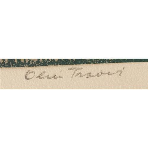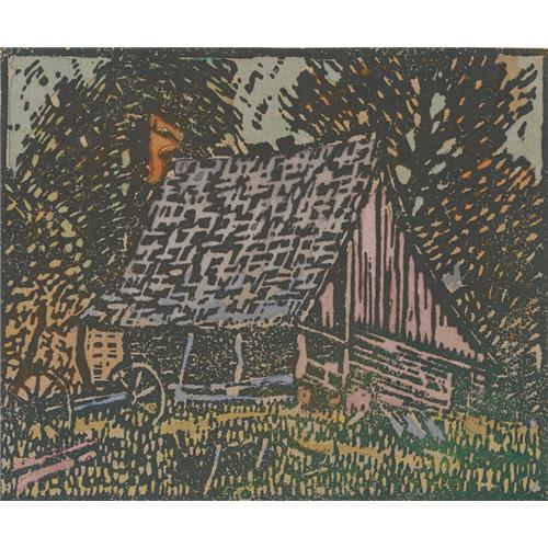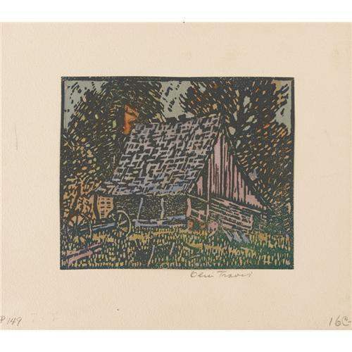 <B>OLIN TRAVIS (1888-1975)</B></I><BR>Untitled Pioneer Cabin<BR>Color-block print<BR>5in. x 6in.<BR>Signed lower right<BR><BR>Provenance:<BR>Collection of the Heard Museum, McKinney, Texas<BR><BR> <B>Condition Report:</B> Excellent condition. Unframed.<BR><BR><b>Shipping:</b> Requires 3rd Party Shipping (<a target="_blank" href="http://www.heritageauctions.com/common/shipping.php">view shipping information</a>)