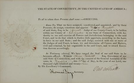 (1760 - 1833) American Revolution soldier and patriot, Secretary of the Treasury succeeding Hamilton. Partly-printed D.S. as Governor of Connecticut, 1p. sm. folio, Hartford, May 31, 1823, an appointment of William Randall to serve as Associate Judge in New London. Partial fold splits at top and bottom margins repaired on verso, matted and set into an antique frame.