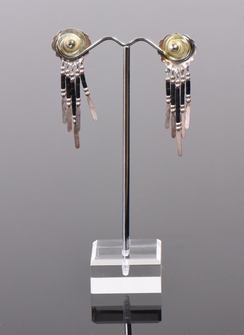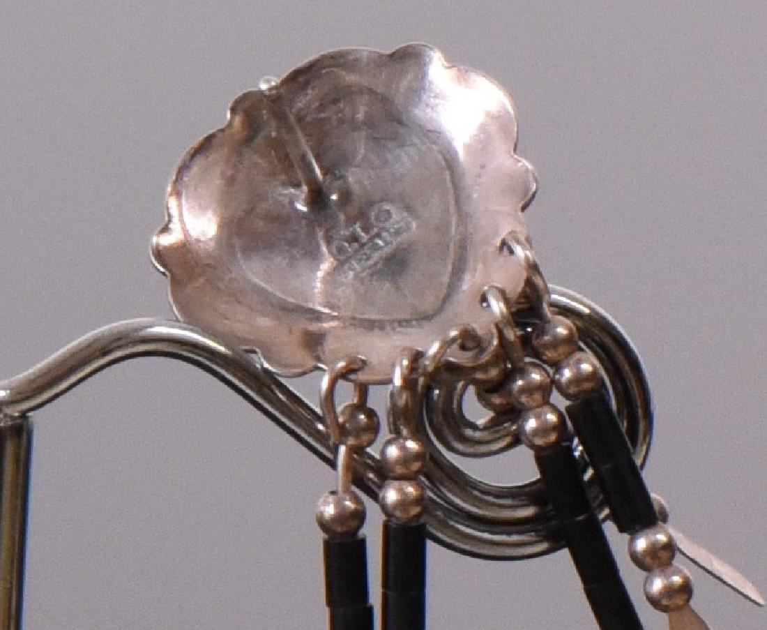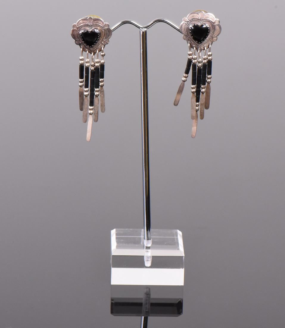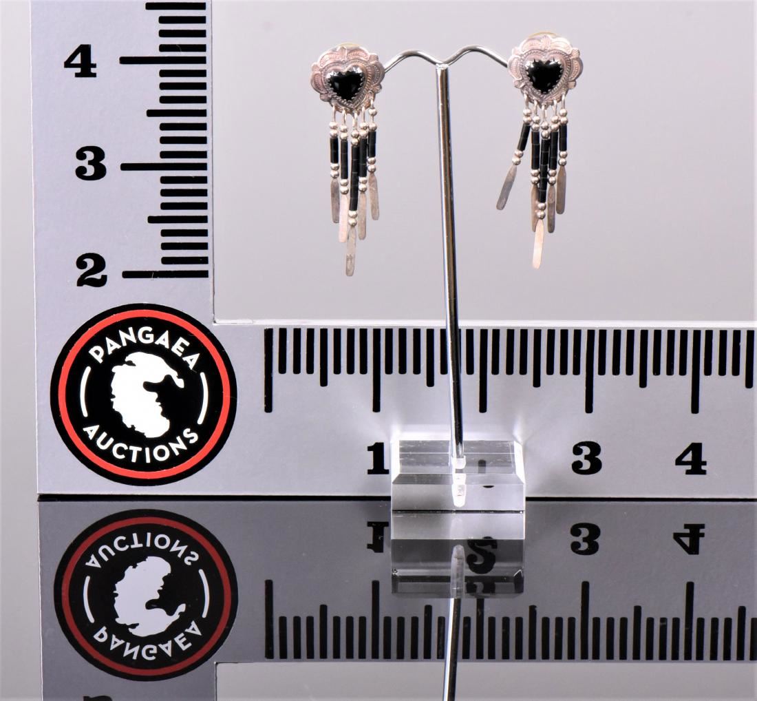 OLO Designer Onyx Heart Shaped Sterling Silver Dangling Earrings. Silver Tested. Base Stand Not Included. Estimated more than 50 yrs old. 925 Sterling Silver consisting of 92.5% silver and 7.5% copper. Tested Positive using Nitric Acid Chemical Scratch Test, Cloth Rub Test, Smell Test, and Magnet Test. Markings of 925 or Sterling stamp. The reason silver needs to be combined with other metals is that it is very difficult to make great designs with just pure silver, which is very soft and malleable. A bit of hardness has to be introduced by adding other metals such as copper. That is why jewelers are capable of making the most intricate an complex designs with 925 Sterling Silver. Silver is one of the most valuable elements next to gold. Mexico is the leading producer of sliver, followed by the United States, Canada, Australia, Spain, Peru, and Russia. Many countries do not require their precious metal items to be stamped and therefore we test to ensure we accurately represent the product. Size: See Ruler Photo. (Photos Represent The Condition Of The Lot.)
