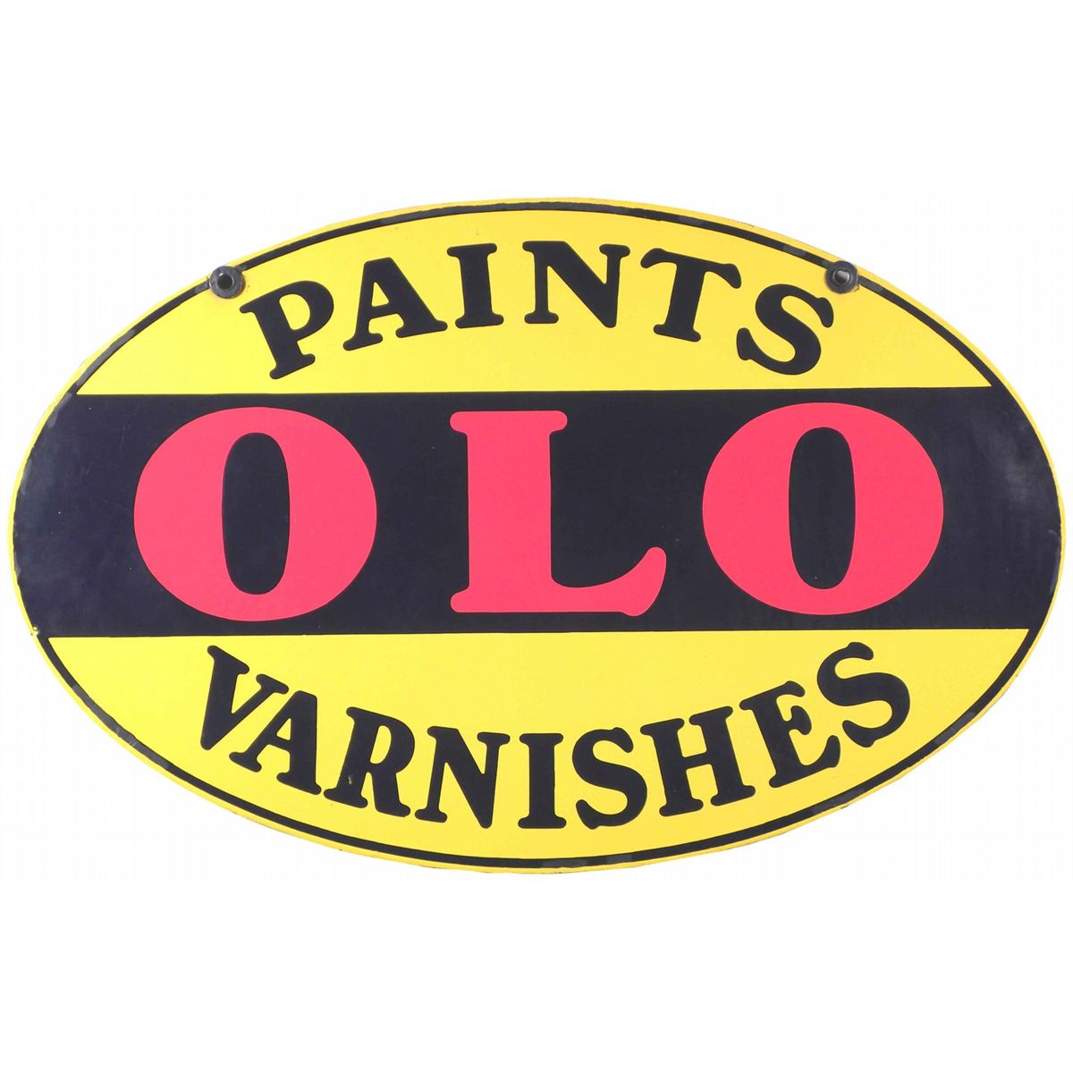 OLO Paints/Varnishes 2 Sided Porcelain Sign. Near mint condition. 27 1/2 X 17 1/2 inches.