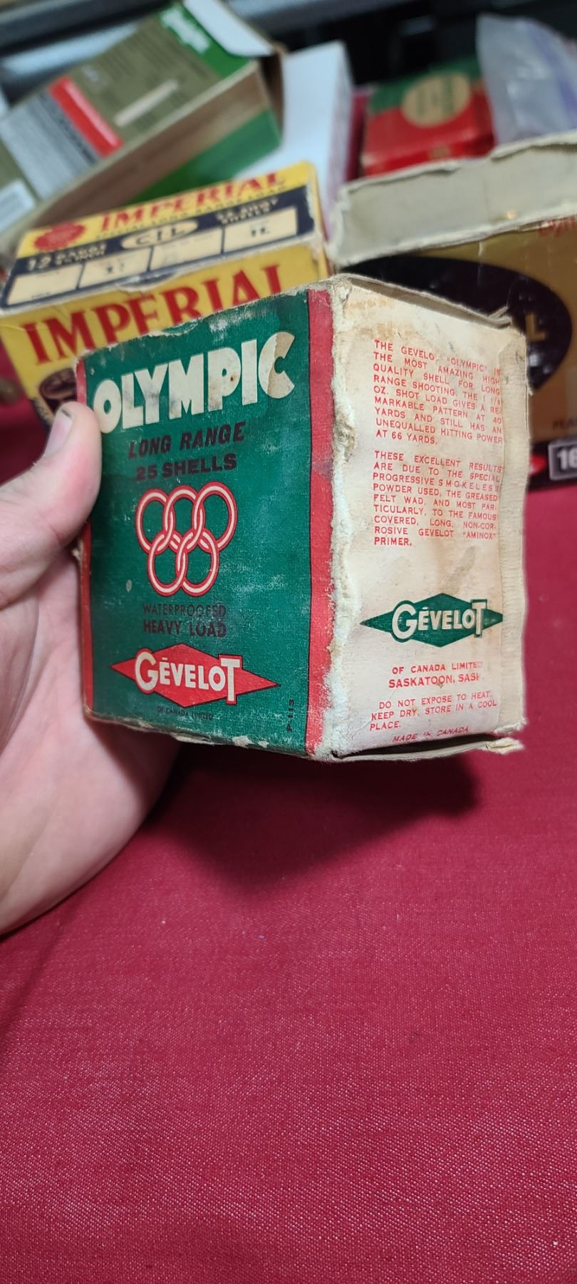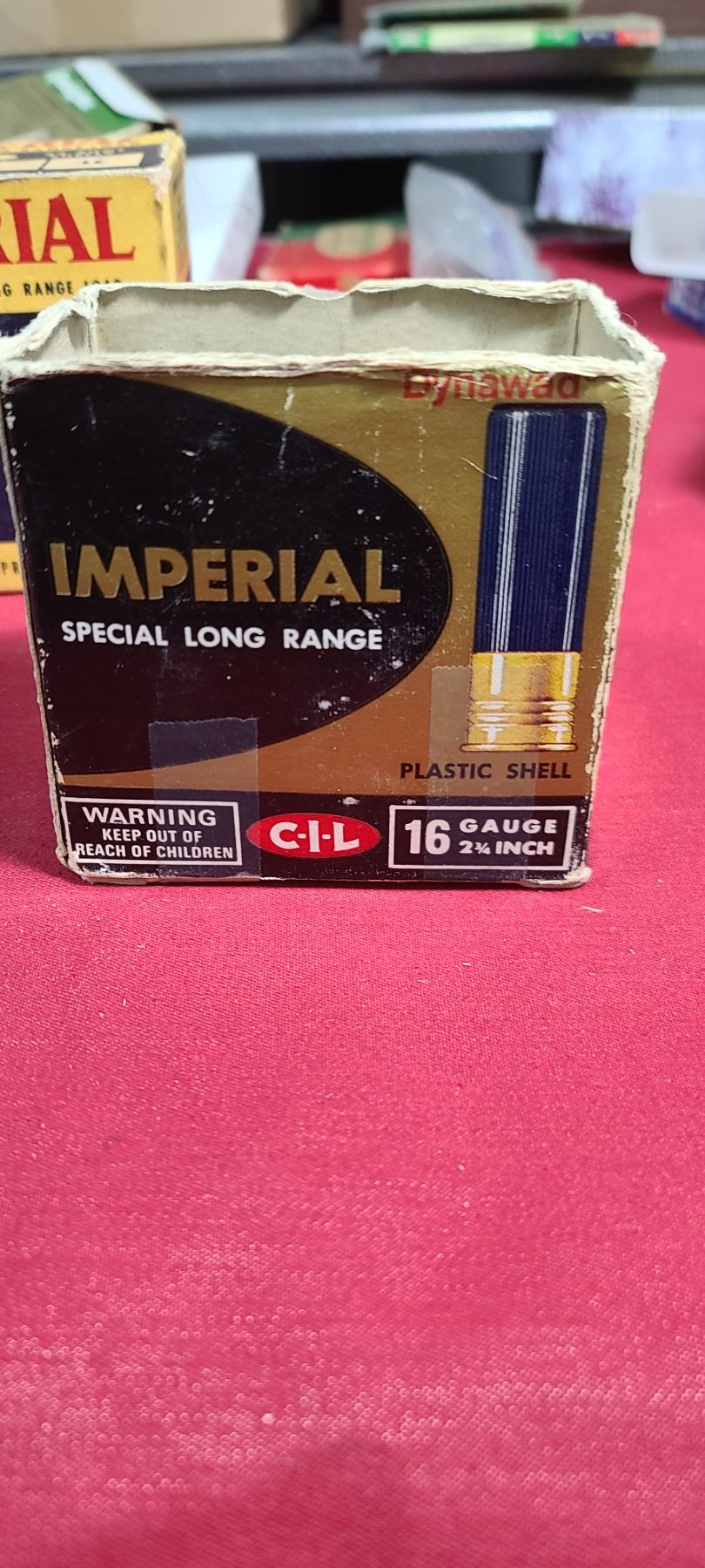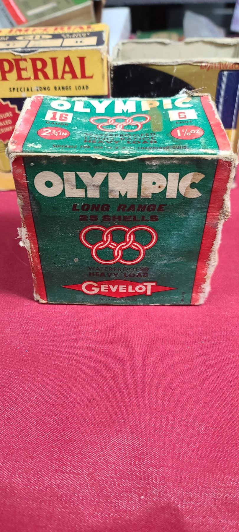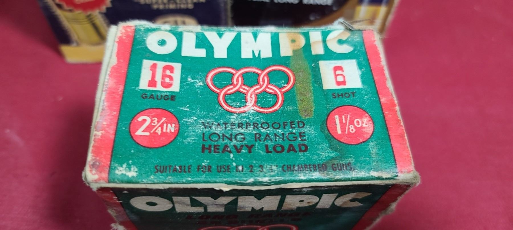OLYMPIC 16GA LONG RANGE 2 3/4" GEVELOT - SOME CORROSION, 19 ROUNDS OF IMPERIAL 16GA 7 1/2 SHOT, PLUS QTY4 #5 SHOT AND VINTAGE CI BOX NO SHIPPING ON AMMUNITION