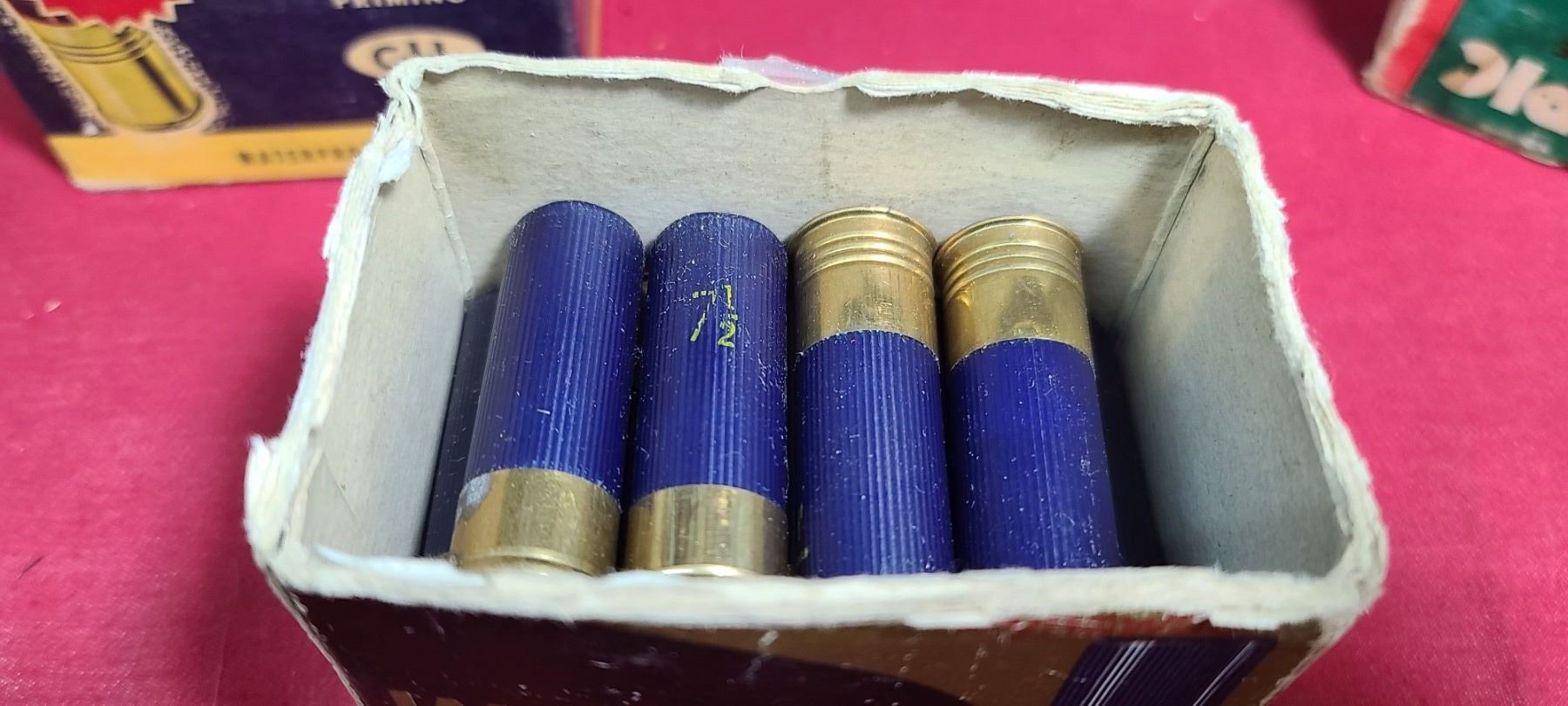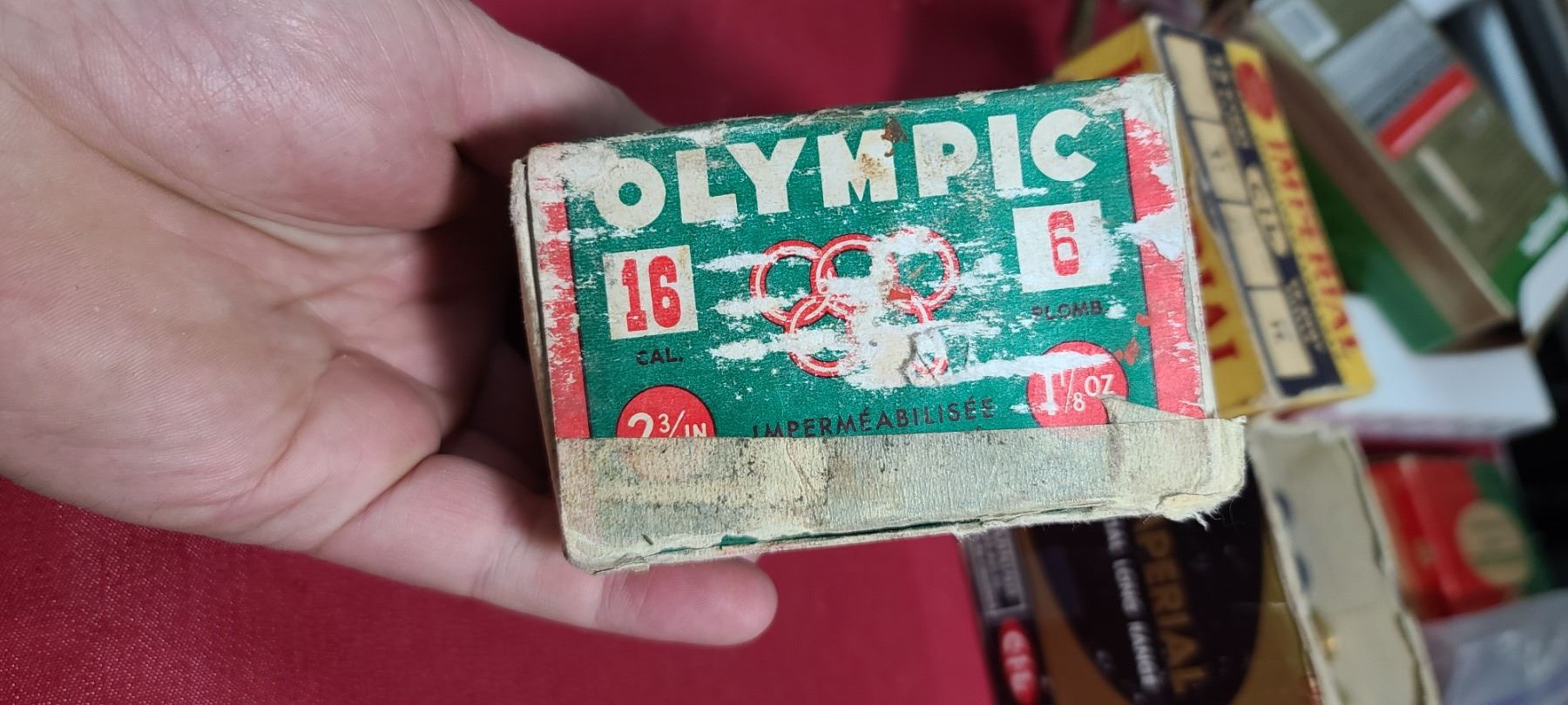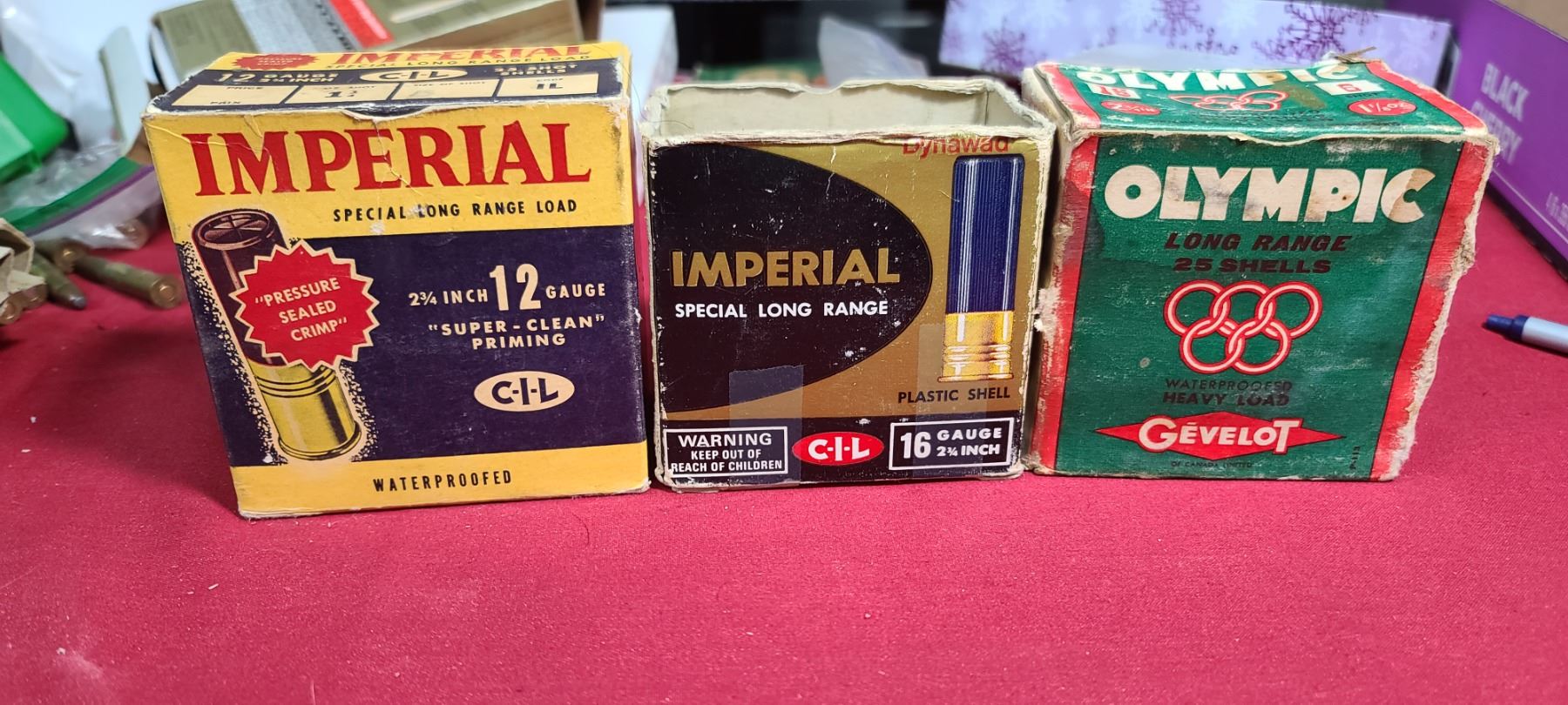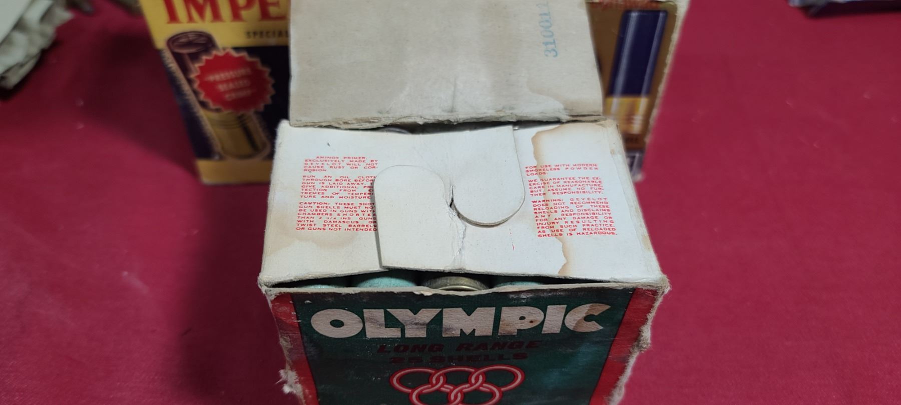 OLYMPIC 16GA LONG RANGE 2 3/4" GEVELOT - SOME CORROSION, 19 ROUNDS OF IMPERIAL 16GA 7 1/2 SHOT, PLUS QTY4 #5 SHOT AND VINTAGE CI BOX NO SHIPPING ON AMMUNITION