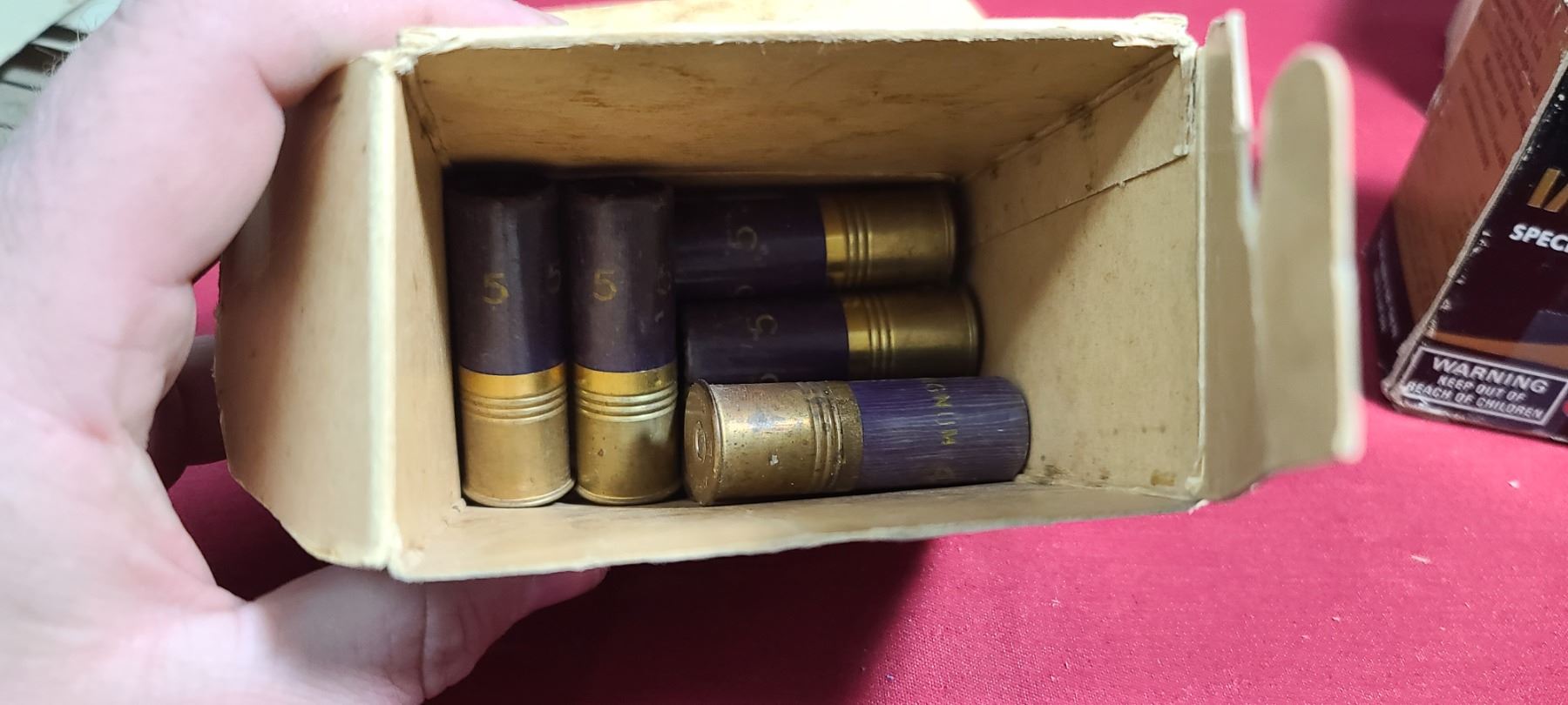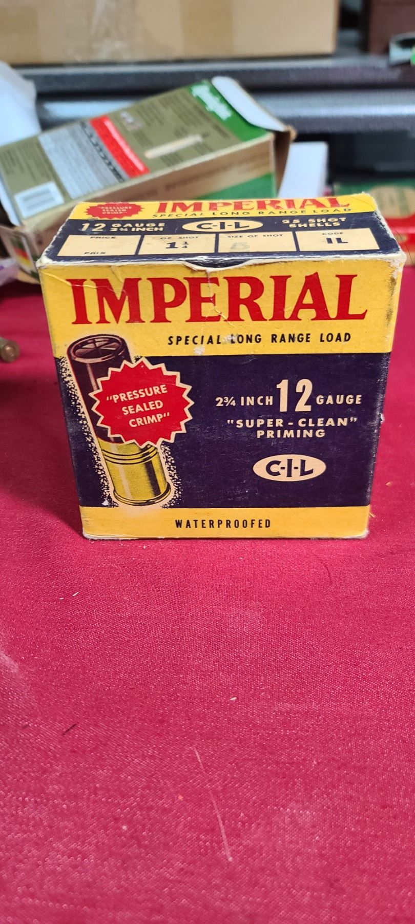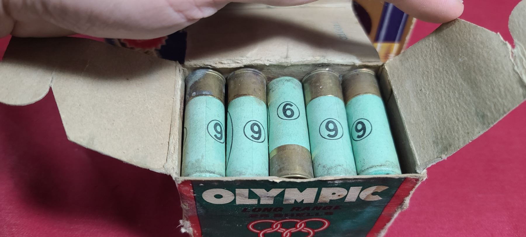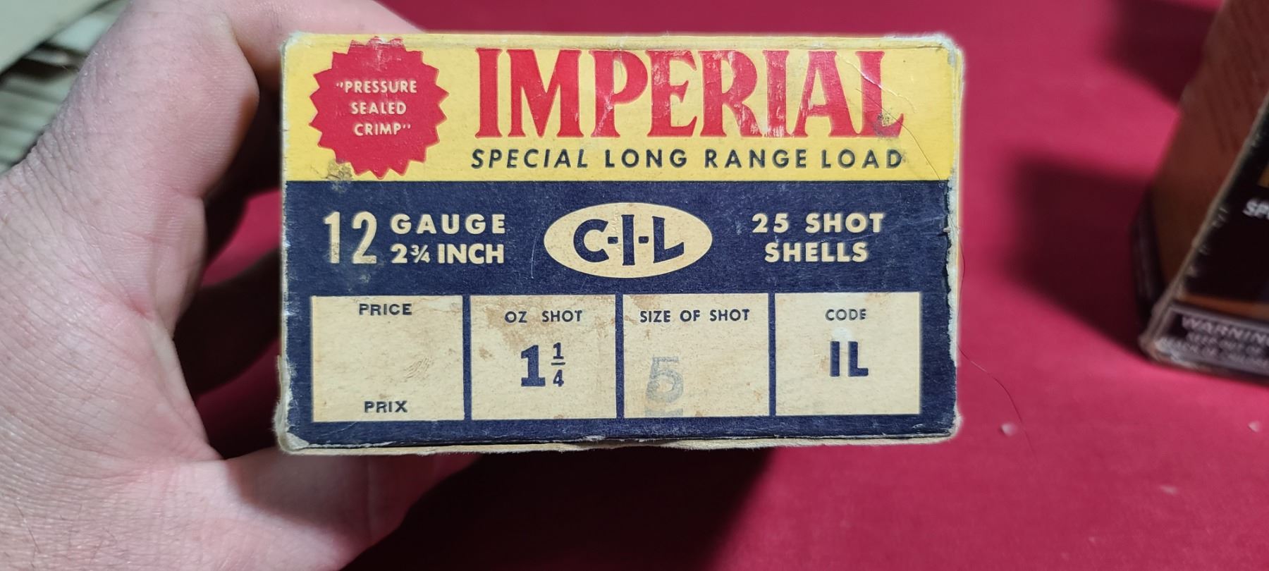 OLYMPIC 16GA LONG RANGE 2 3/4" GEVELOT - SOME CORROSION, 19 ROUNDS OF IMPERIAL 16GA 7 1/2 SHOT, PLUS QTY4 #5 SHOT AND VINTAGE CI BOX NO SHIPPING ON AMMUNITION