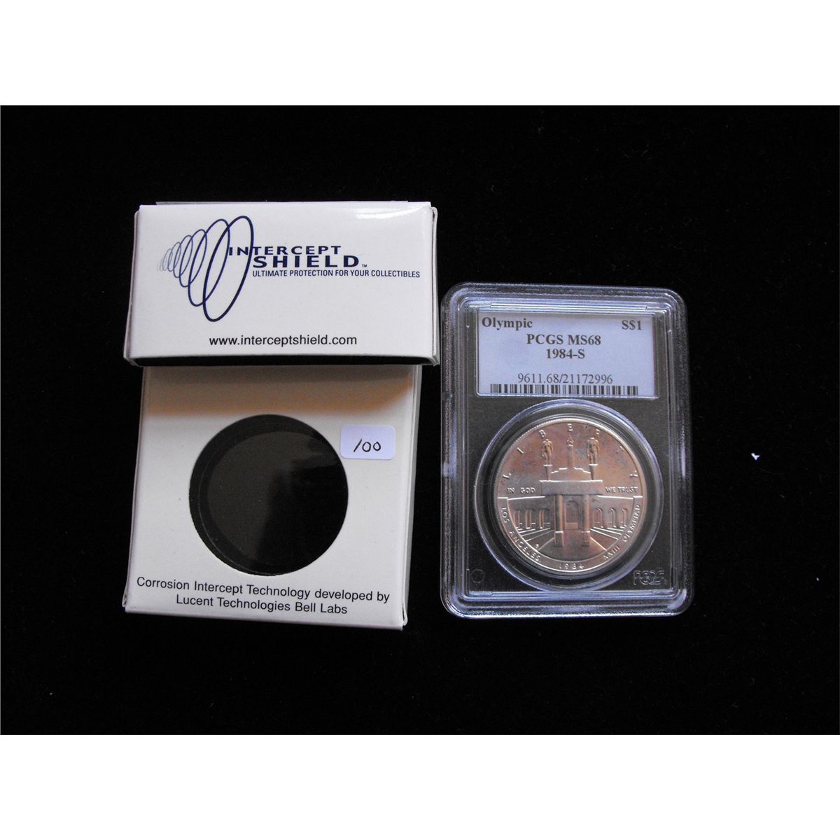 OLYMPIC PCGS MS68 SILVER DOLLAR 1984 INTERCEPT SHIELD BOX