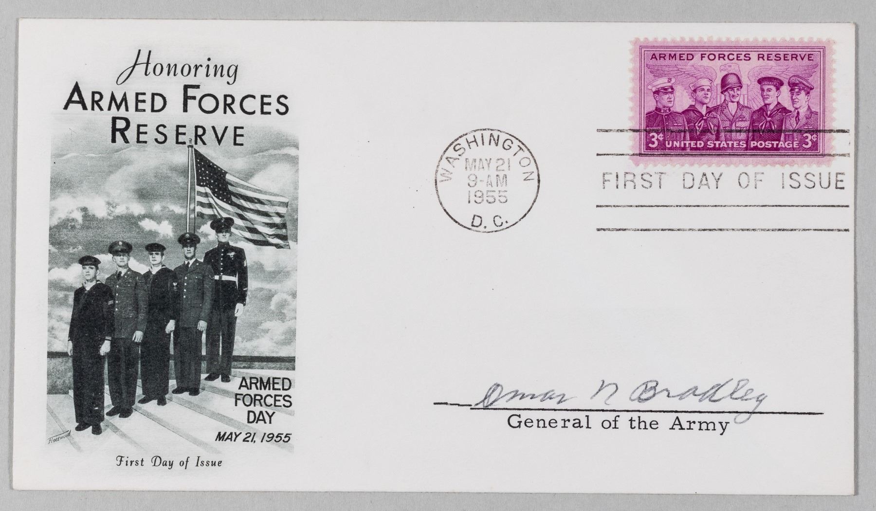 (1893-1981) American general of World War II who commanded forty-three divisions and 1.3 million men, the largest body of American soldiers ever to serve under a single field commander. He was later Chairman of the Joint Chiefs. Signed First Day Cover, Washington D.C. May 21, 1955, a 3 cent Armed Forces Reserve stamp with a cachet honoring the Armed Forces Reserve. Signed in black ink. 3.5 x 6.5 inches.