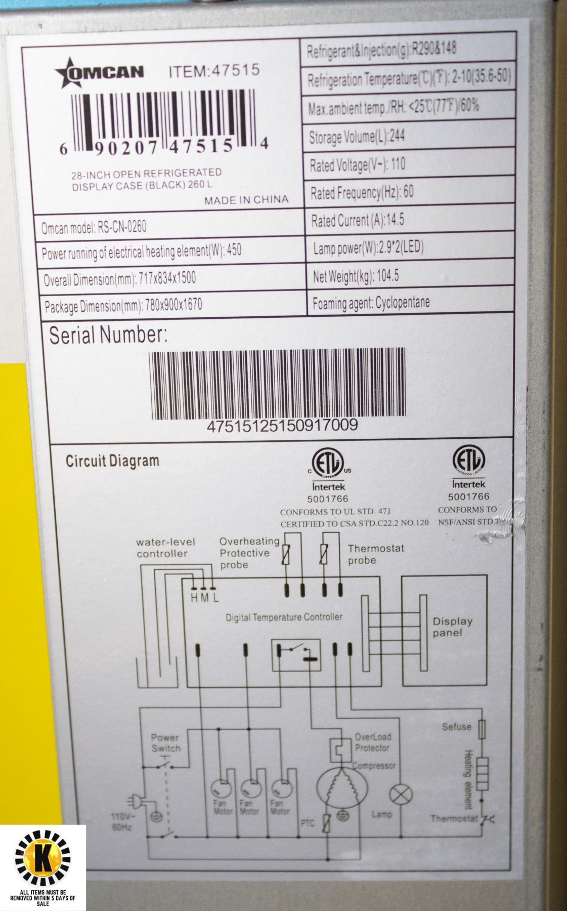 MODEL: RS-CN-0260. 110V, SINGLE PHASE, 14.5 AMPS. 9.18 CU.FT. 28.25" X 33" X 60"