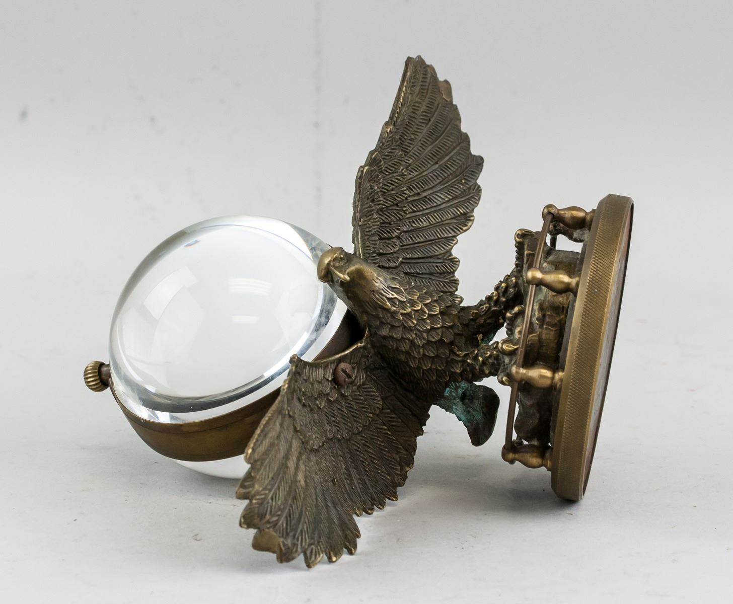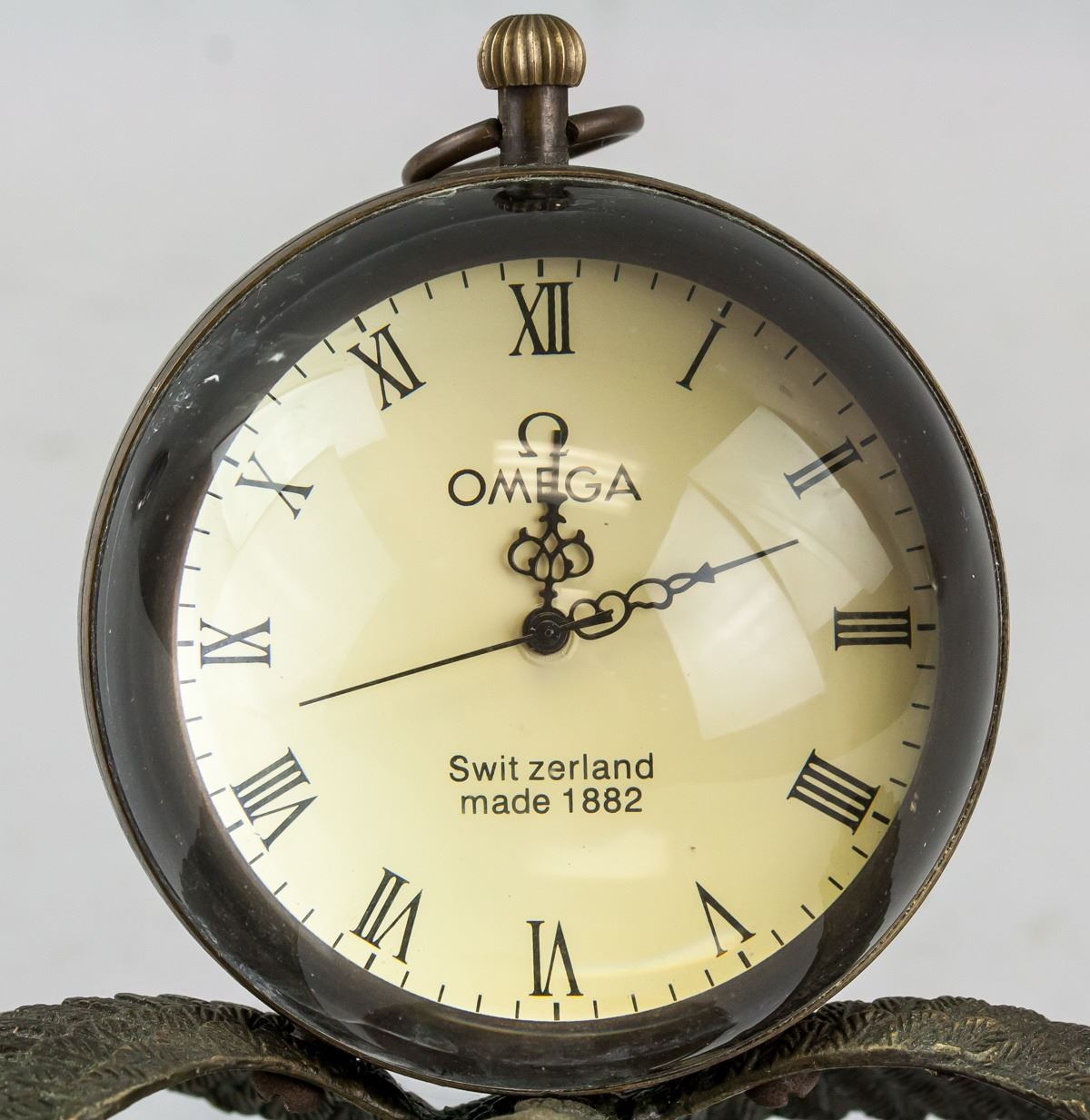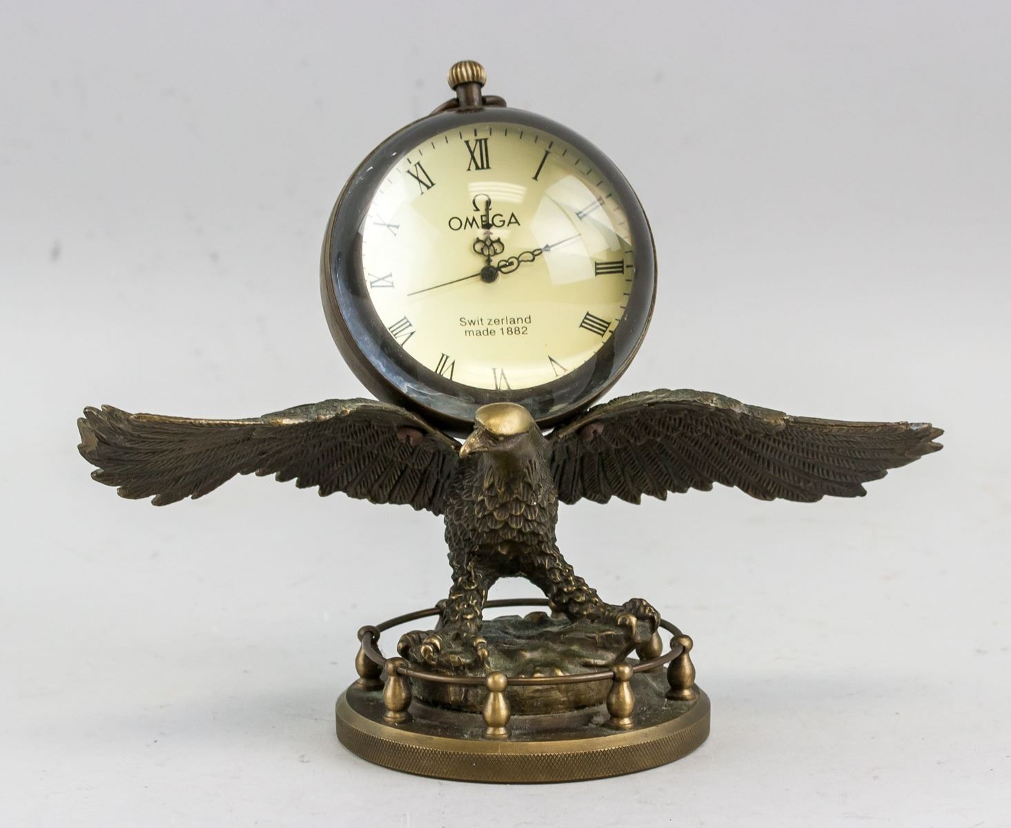 Table clock. Of globular body. Hold by an eagle with stand. Marked OMEGA, Swit zerland, made 1882. In working condition. 18 x 20 cm, 1418 grams