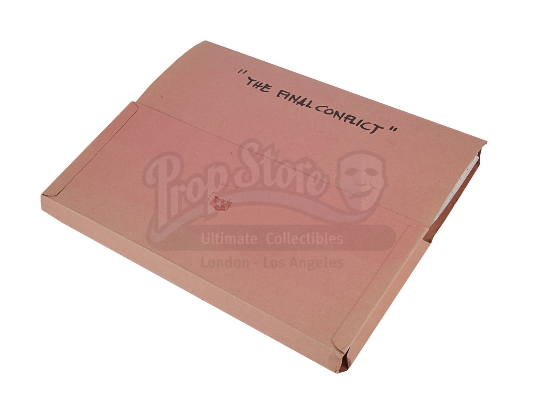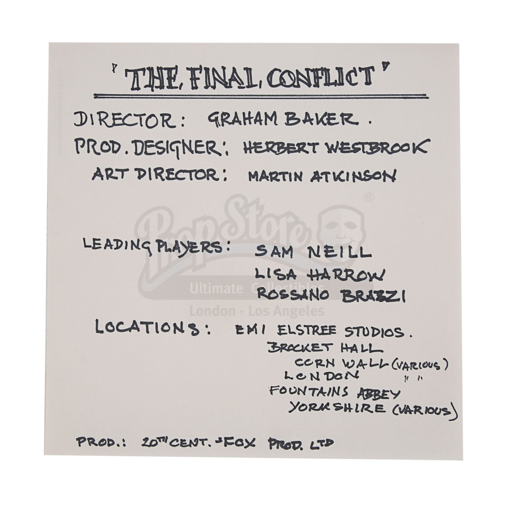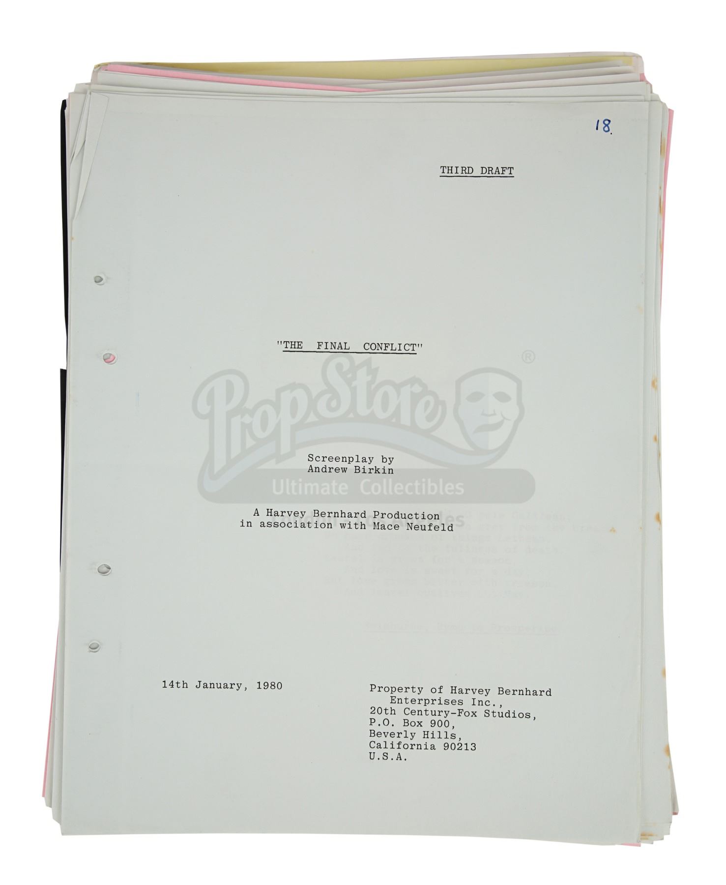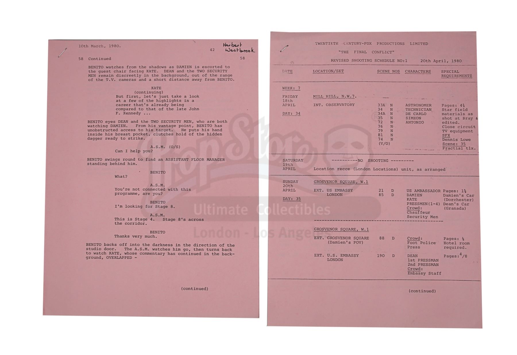 The accompanying collection of paperwork includes additional script revision pages, a cast list, shooting schedules, unit lists, budget lists, a film negative and a photo processed from the negative. Some of the sheets display Westbrook's name, and there are several handwritten annotations. Presented in a pink folder labelled "The Final Conflict", the set displays some signs of age, including minor edge wear, creasing, folded corners and staining on some script pages. Dimensions (script): 28.5 cm x 22 cm x 2 cm (11 1/4" x 8 3/4" x 3/4")