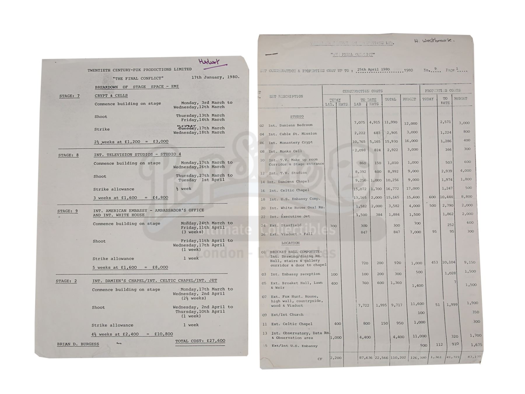 A third draft script and a collection of production paperwork from Graham Baker's horror sequel Omen III: The Final Conflict. This lot was originally obtained from the family of production designer Herbert Westbrook.