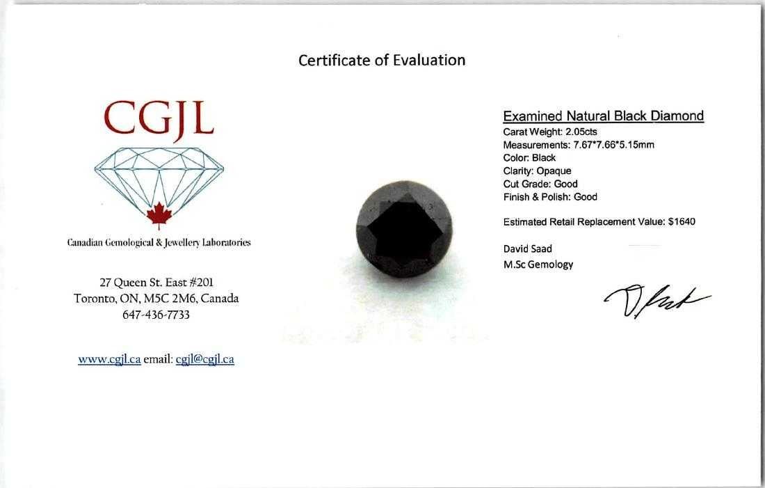 ONE 2.05 CT CERTIFIED 100 % NATURAL ROUND CUT BLACK DIAMOND SOLITARE. MEASURES 7.67 x 66.5 x 15 mm. EXHIBITING A FINE SILKY BLACK LUSTER AND POLISHED FINISH. PLEASE SEE CERTIFICATION FOR FURTHER DETAILS. PERFECT SIZE FOR A RING SETTING.