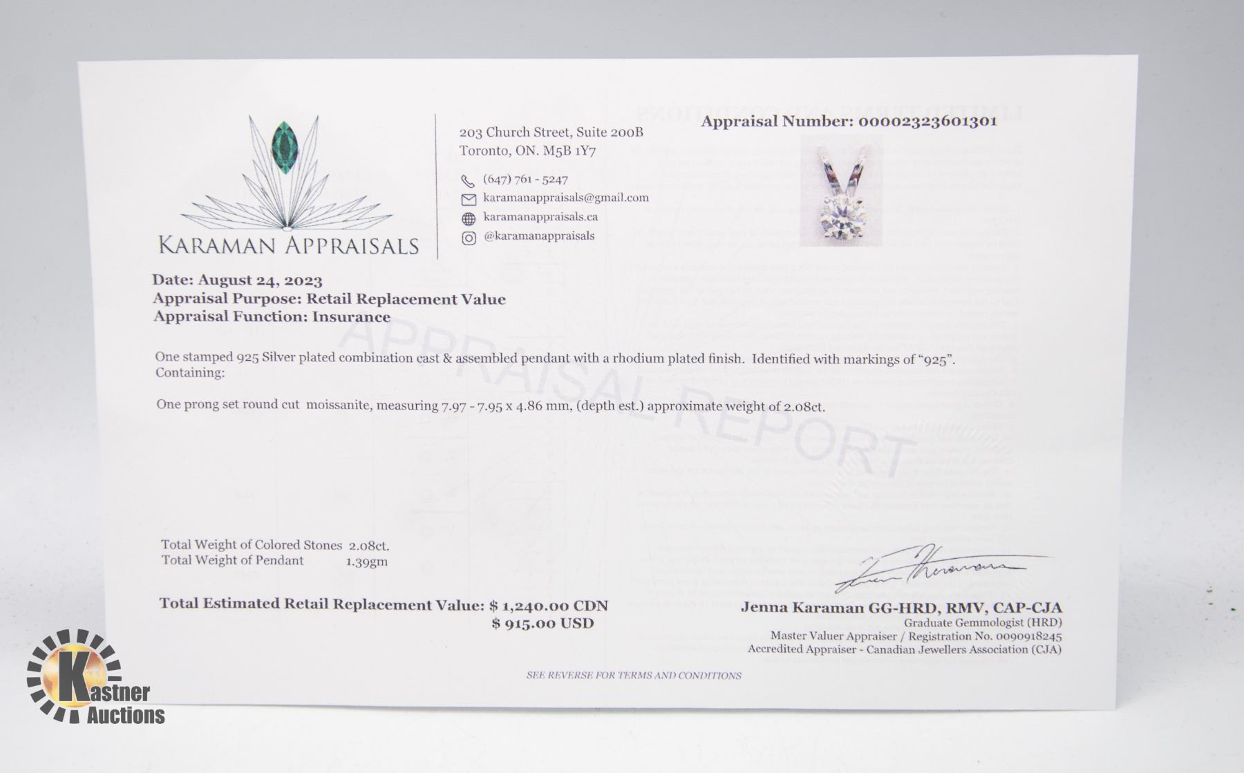 MOISSANITE PENDANT WEIGHING 2.08 CARAT AND APPRAISED VALUE $1,240.00 **ALL ITEMS MUST BE REMOVED BY 5PM SATURDAY, DECEMBER 2ND 2023. ALL REMAINING ITEMS WILL BE SUBJECT TO A $6.00 PER DAY STORAGE CHARGE. ANY ITEMS REMAINING AFTER MONDAY, DECEMBER 18TH, 2023 WILL BE CONSIDERED FORFEITED. NO REFUNDS WILL BE ISSUED FOR FORFEITED ITEMS. TO SCHEDULE A PICK UP APPOINTMENT CLICK HERE
