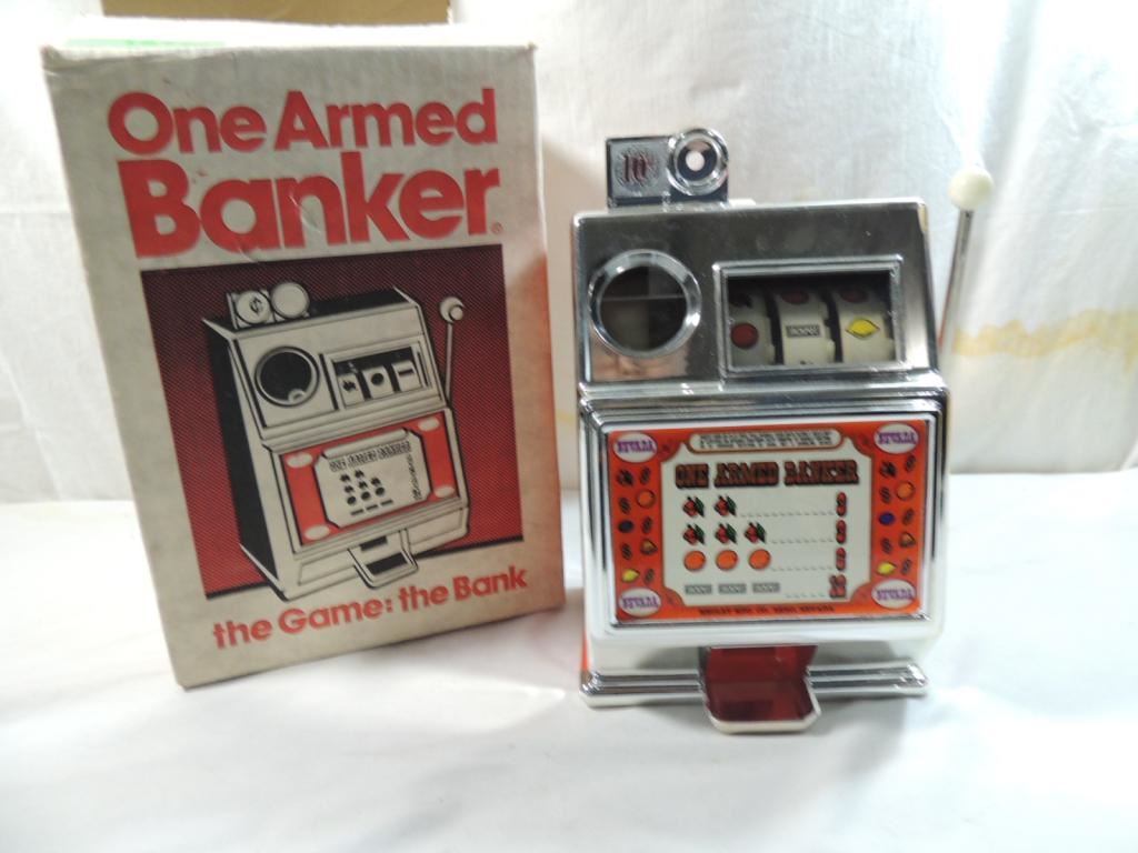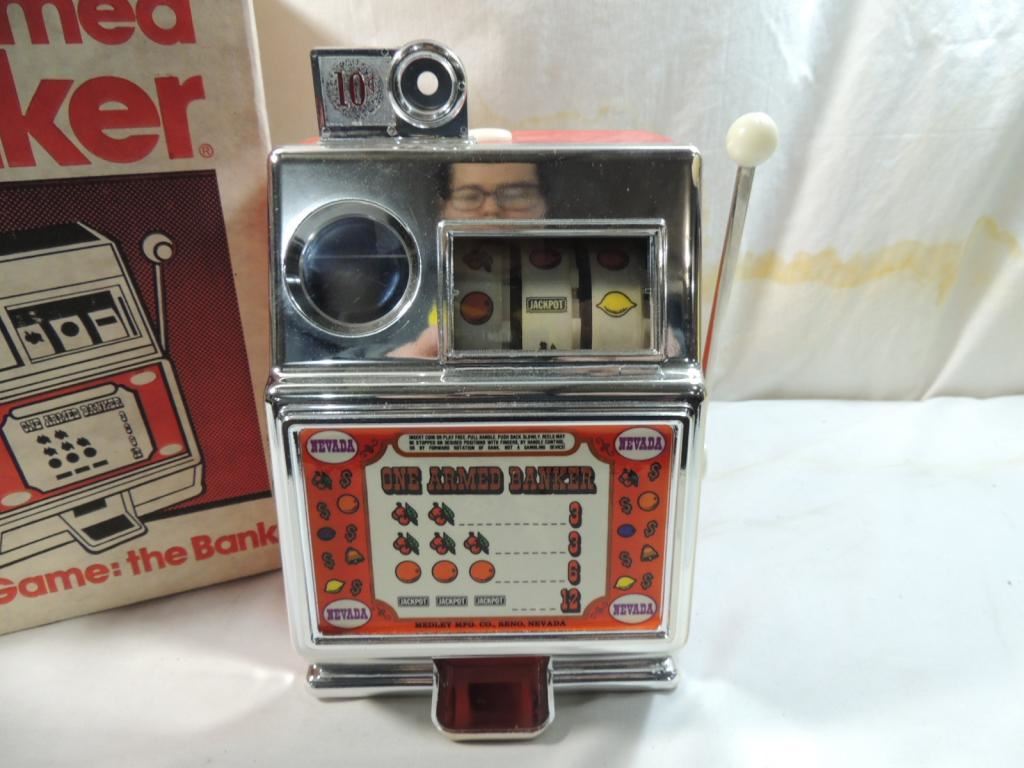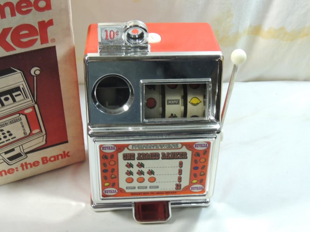 SLOT MACHINE BANK, VEGAS GAME BANK, CASINO GAME BANK, IN ORIGINAL BOX, COLLECTIBLE FUN, GOOD CONITION AS SHOWN SEE PHOTO FOR MORE DETAILS.