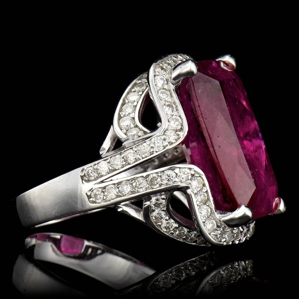 ONE CENTER CUSHION CUT RUBELLITE TOURMALINE TW 15.26CTS, 1.43CTS TW ROUND CUT DIAMONDS, 14K WG RING 7.23GR