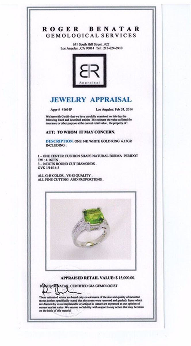 ONE CENTER CUSHION SHAPE NATURAL BURMA PERIDOT TW:4.16CTS, 0.63CTS ROUND CUT DIAMONDS, 14K WG RING 6.13GR