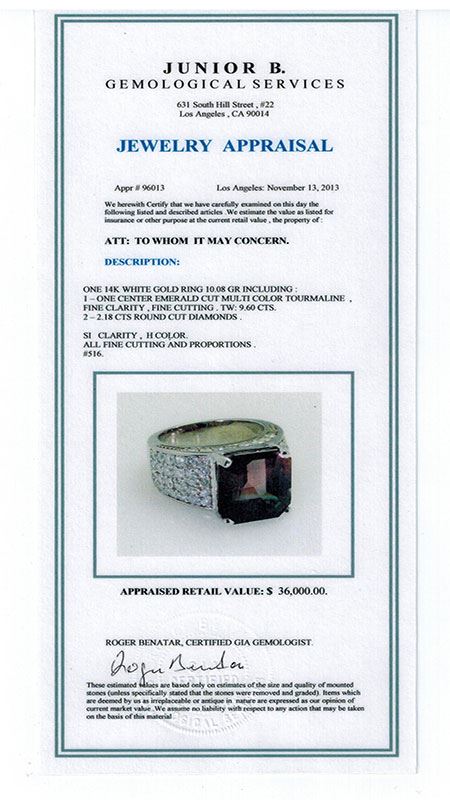 ONE CENTER EMERALD CUT MULTI COLOR TOURMALINE TW:9.60CTS, 2.18 CTS ROUND CUT DIAMONDS, ONE 14 WHITE GOLD RING 10.08GR