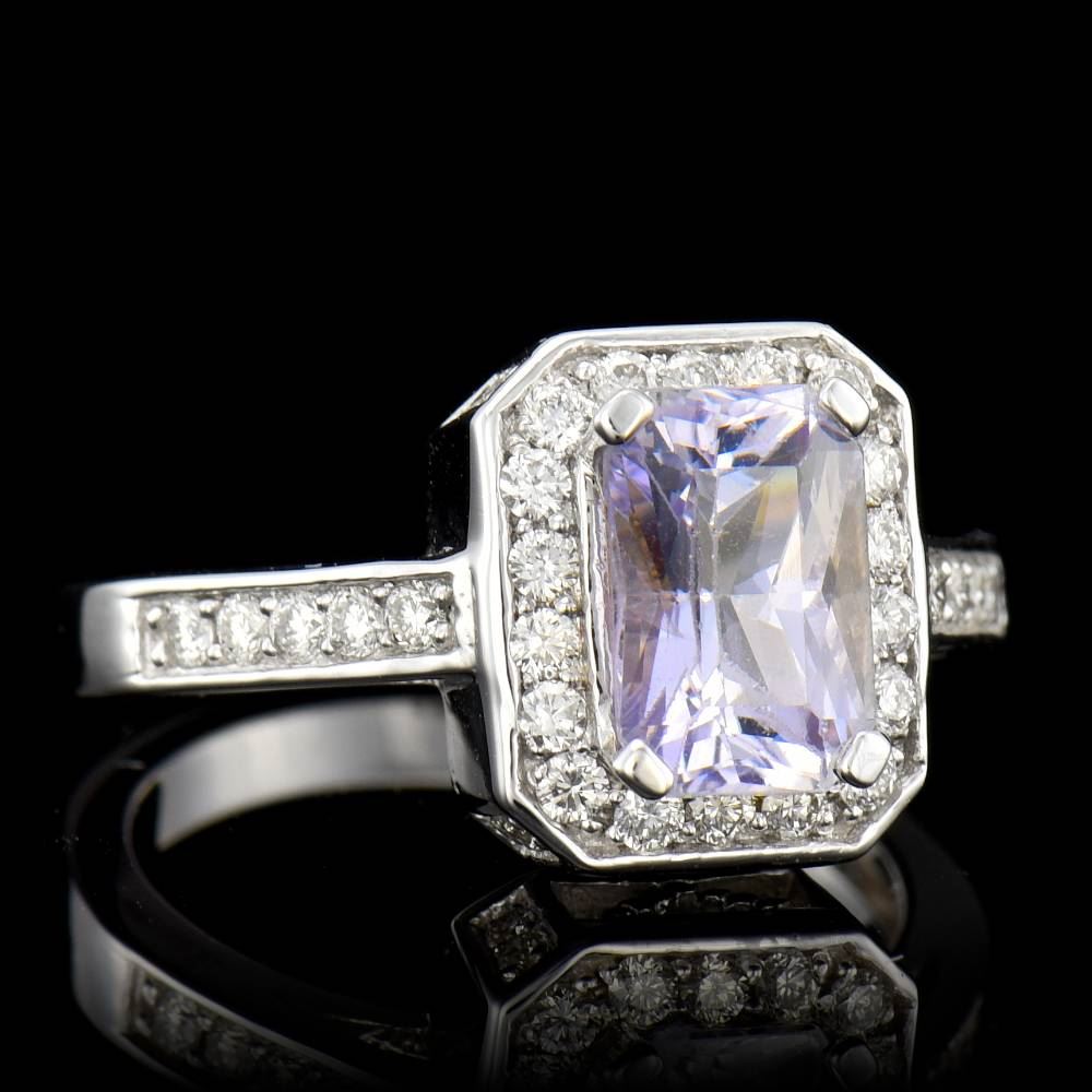 ONE CENTER EMERALD CUT WHITE SAPPHIRE TW 2.20CTS, 0.49CTS TW ROUND CUT DIAMONDS, 14K WG RING 4.63GR