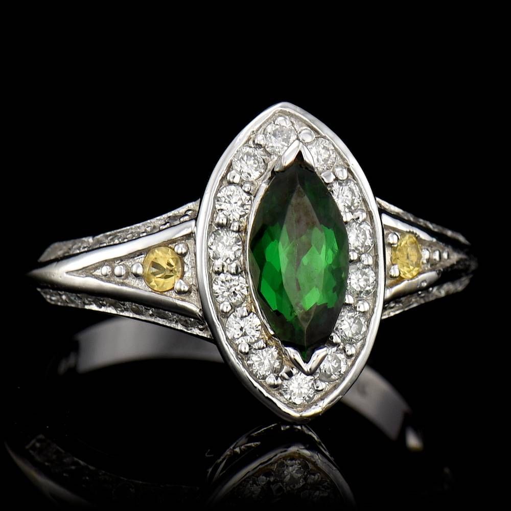ONE CENTER MARQUIS SHAPE NATURAL TSAVORITE TW:0.86CTS, 0.07CTS TW NATURAL CEYLON YELLOW SAPPHIRE, 0.42CTS TW ROUND CUT, 14KWG RING 4.38GR