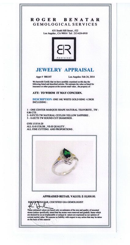 • Important Notices & Disclaimers- PLEASE READ REGARDING APPRAISED JEWELRY AND LOOSE STONES-DNJA sends them out to a third party for Retail Replacement Value Appraisals, which are the most common. these types of evolutions are written for insurance needs. This would be the cost to REPLACE the jewelry with an item of equal quality and kind, considered to be the current market price or replacement value. This type of appraisal is done to protect you (the bidder) in the event of damage or loss of a valuable item. Our appraisals are conducted by independent 3rd party appraisal firms that utilizes Certified GIA Gemologist. Appraisals should be used for verification of gemstone and/or metal weight, size and grade ONLY, not actual value. appraisal value should be considered for insurance purposes ONLY, not actual value, as price varies greatly from retail locations throughout the world. Items should not be purchased with the expectation to resell for appraisal rice, or for profit.