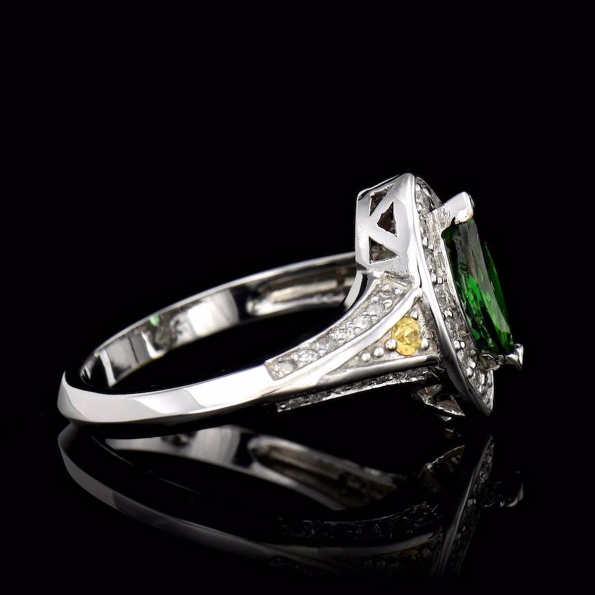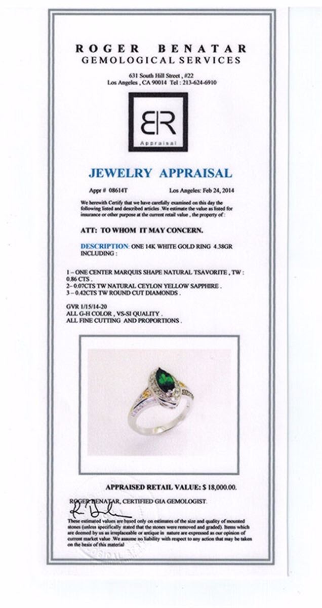 ONE CENTER MARQUIS SHAPE NATURAL TSAVORITE TW:0.86CTS, 0.07CTS TW NATURAL CEYLON YELLOW SAPPHIRE, 0.42CTS TW ROUND CUT, 14KWG RING 4.38GR