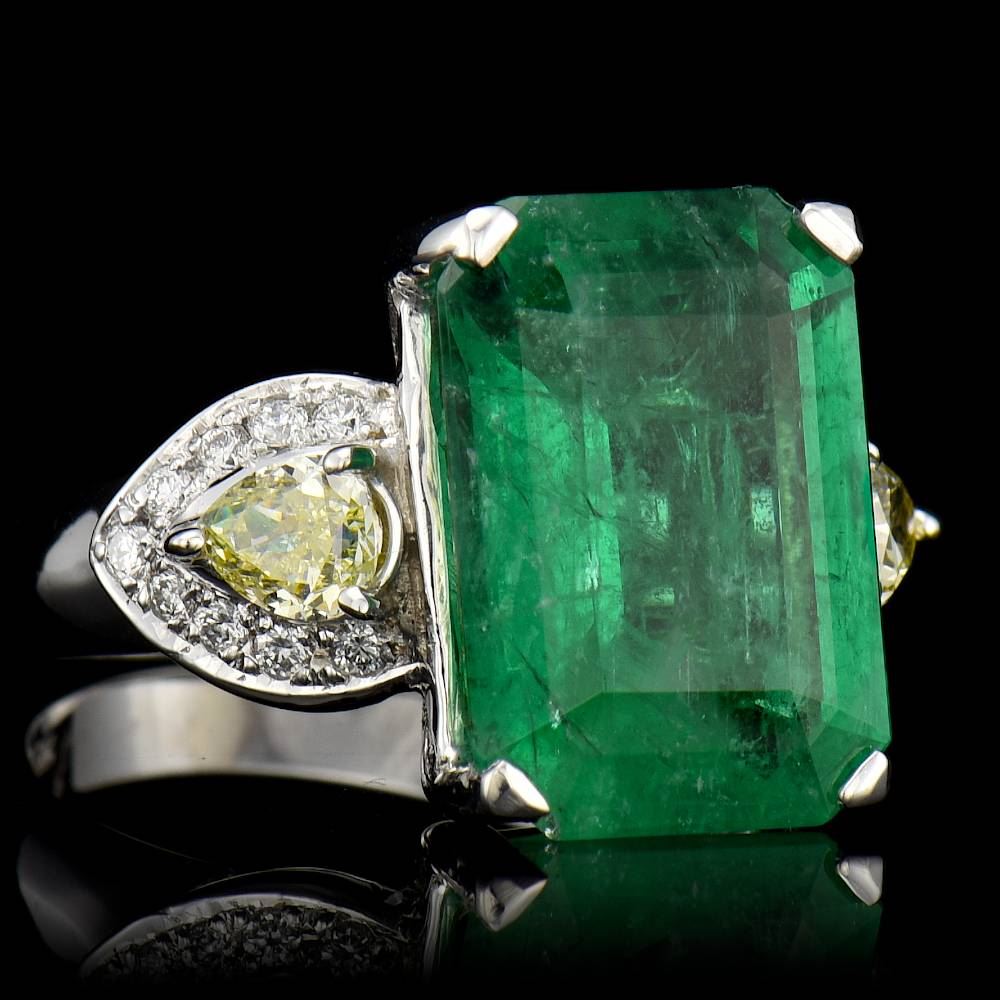 ONE CENTER NATURAL EMERALD CUT COLOMBIAN EMERALD TW 9.40CTS TOP COLOR, FINE CUTTING, 0.28CTS TW ROUND CUT DIAMONDS, 2 PCS. PEAR SHAPE NATURAL FANCY YELLOW DIAMONDS TW 0.77CTS, 18K WG RING 9.00GR