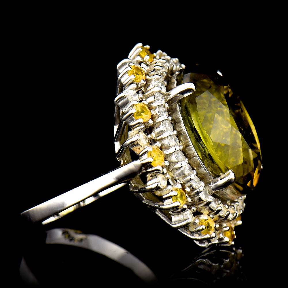 ONE CENTER OVAL CTU GREEN TOURMALINE TW:12.47CTS, 0.76 CTS ROUND CUT YELLOW SAPPHIRE & 0.60CTS TW ROUND CUT DIAMONDS. ONE 14K WHITE GOLD RING 7.02G